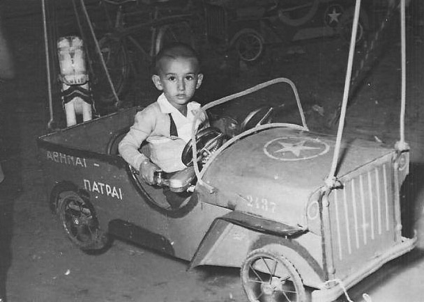 Εκεί στην αρχή του πανηγυριού ήταν στημένο το φτωχικό «Λούνα Παρκ»: Αυτοκινητάκια και αλογάκια που γύριζαν γύρω-γύρω και βαρκούλες. Ο πατέρας μου πλήρωσε τον άνθρωπο στα αυτοκινητάκια κι εκείνος με άρπαξε από τις μασχάλες και με «πέταξε» μέσα σ’ ένα αμερικάνικο στρατιωτικό τζιπάκι που έφερε την επιγραφή: «ΑΘΗΝΑΙ- ΠΑΤΡΑΙ»!!! Πάνω στη δεξιά πόρτα είχε ένα κουμπί που όταν το πάταγες κορνάριζε. Είχε κι ένα τιμονάκι που όπου και να το έστριβες το αυτοκίνητο δεν υπάκουε και πήγαινε στην καθορισμένη πορεία του, όπως συμβαίνει μερικές φορές και με τη ζωή μας που αλλού στρίβεις για να πας κι εκείνη αλλού σε πάει.