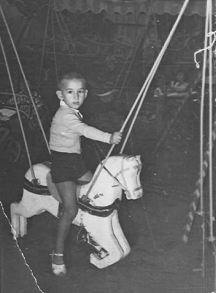 Όταν τα «αυτοκινητάκια» απόχτησαν επαρκή ταχύτητα γυρίσματος, το γυφτάκι μ’ ένα σάλτο καβάλησε κάποιο αδειανό αλογάκι και ταξίδεψε μαζί μας. Ίσως αυτή να ήταν και η συμφωνημένη με το αφεντικό αμοιβή του! Όταν λιγόστευε η ταχύτητα, το γυφτάκι πηδούσε κάτω και ξανάρχιζε το γύρισμα τρέχοντας κι αυτό γύρω - γύρω, μέχρι που το αφεντικό φρενάριζε το γύρισμα με τα χέρια του και μας κατέβαζε, για να μπουν και τ’ άλλα τα παιδιά που περίμεναν ολόγυρα. Θυμάμαι που σ’ όλη τη διαδρομή είχα το ένα χέρι στο κουμπί της κόρνας και κορνάριζα αδιάκοπα, όπως (άλλωστε ) όλα τα παιδιά που ήταν στα αυτοκινητάκια, και το άλλο στο τιμόνι. Μετά ο πατέρας μου ξαναπλήρωσε και με ανέβασε και σ’ ένα άσπρο αλογάκι με ζωγραφιστά χάμουρα και σέλα και χόρτασα καλπασμό, με τον αέρα να χαϊδεύει το κουρεμένο-γουλί κεφάλι μου. Λεφτά για να μπω και στις βαρκούλες δεν περίσσευαν: «Του χρόνου θα μπεις και στις βαρκούλες» μου είπε ο πατέρας μου. Έμεινα μόνο λίγο εκεί να τις αποθαυμάζω. Οι βαρκούλες ήταν μικρές και μεγάλες, ανάλογα με τα παιδιά. Έμπαινες μέσα στη βαρκούλα, απέναντί σου ένα άλλο παιδί και πιάνατε γερά, χιαστί, δυο σχοινιά που κρέμονταν δεμένα από το σίδερο στο πάνω μέρος. Άρχιζαν τα παιδιά να τραβούν τα σχοινιά τους, μία το ένα και μία το άλλο, και η βάρκα κουνιότανε ανεβοκατεβαίνοντας. Όσο πιο δυνατά τραβούσαν τα παιδιά τα σχοινιά, τόσο πιο ψηλά πήγαινε η βάρκα.