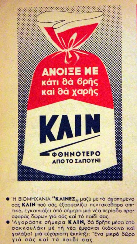 Το ΚΛΙΝ ήταν η πρώτη σκόνη πλυσίματος που βγήκε στην αγορά στη 10ετία του '60. Ήταν συσκευασμένη σε νάυλον σακουλάκια και προκειμένου να ελκύσει τις νοικοκυρές, σε κάθε σακουλάκι μέσα, είχε ένα πλαστικό παιχνιδάκι: στρατιωτάκι, καου-μπόυ ή ινδιάνο. Βέβαια το «να ελκύσει τις νοικοκυρές» σήμαινε «να πιεστούν οι μανάδες από τα παιδιά να αγοράσουν «ΚΛΙΝ»» για να βρουν εκείνα το παιχνιδάκι που ήταν στη σακούλα.