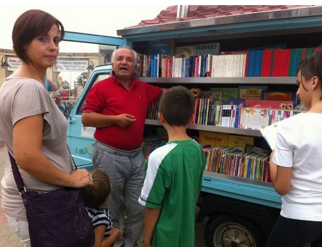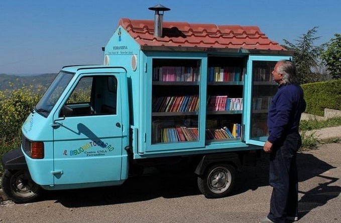 Αγόρασε ένα μεταχειρισμένο τρίκυκλο, και το διαμόρφωσε σαν σπίτι του βιβλίου. Με τα λιγοστά χρήματα της σύνταξης το γέμισε βιβλία, εφτακόσια χωράει, και πήρε τους δρόμους, τα βουνά τα λαγκάδια, τις παραλίες.