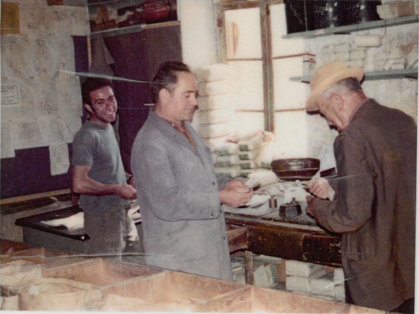 φωτο4: Ο κυρ-Νίκος Περγαντής, με πελάτη και με τον γιο του τον Σταύρο, στο κατάστημα της Όθωνος-Αμαλίας. Στον τοίχο αριστερά οι ζωγραφιές των παιδιών.
