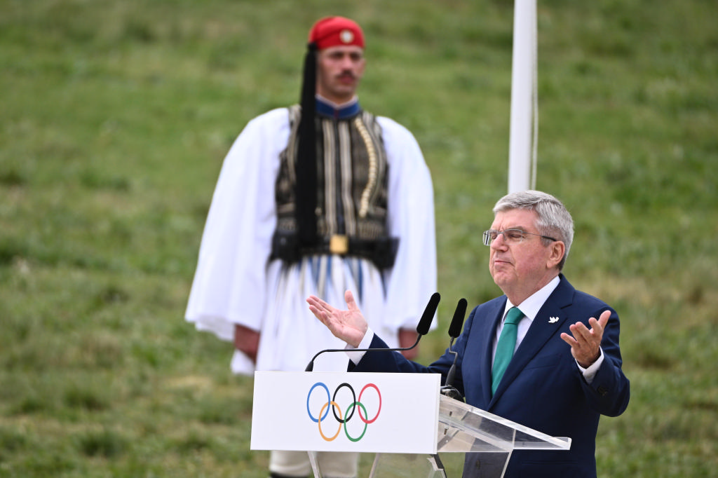 Ο πρόεδρος της Διεθνούς Ολυμπιακής Επιτροπής, Τόμας Μπαχ, μεταξύ άλλων είπε: «Σε αυτήν την ιερή γη όπου βρισκόμαστε σήμερα, γεννήθηκε το μεγάλο αυτό δώρο της ανθρωπότητας πριν από περίπου 3.000 χρόνια: οι Ολυμπιακοί Αγώνες. Είμαστε ευγνώμονες στους Έλληνες μέχρι και σήμερα για αυτό το δώρο...» Συμπλήρωσε δε: «…Από την αρχαιότητα υπάρχει άρρηκτος δεσμός μεταξύ των Ολυμπιακών Αγώνων και της ειρήνης. Η Ολυμπιακή Εκεχειρία, αποτέλεσε το θεμέλιο για την ειρηνική πραγματοποίηση των Ολυμπιακών Αγώνων στην αρχαιότητα. Αυτή η ιδέα της προώθησης της ειρήνης και της ελπίδας μέσω του αθλητισμού υιοθετήθηκε από τον Πιερ Ντε Κουμπερτέν όταν αναβίωσε τους σύγχρονους Ολυμπιακούς Αγώνες πριν από σχεδόν 130 χρόνια». Πάντα οραματιστής, είπε: «Οι Ολυμπιακοί Αγώνες είναι ένα προσκύνημα στο παρελθόν και μια πράξη πίστης στο μέλλον».
