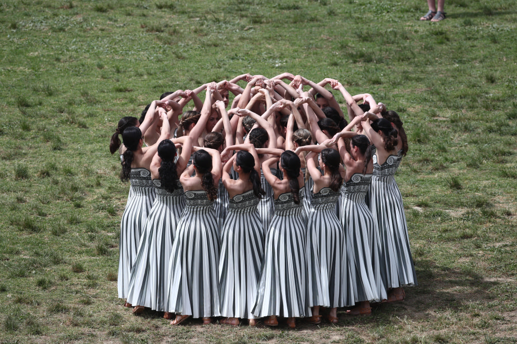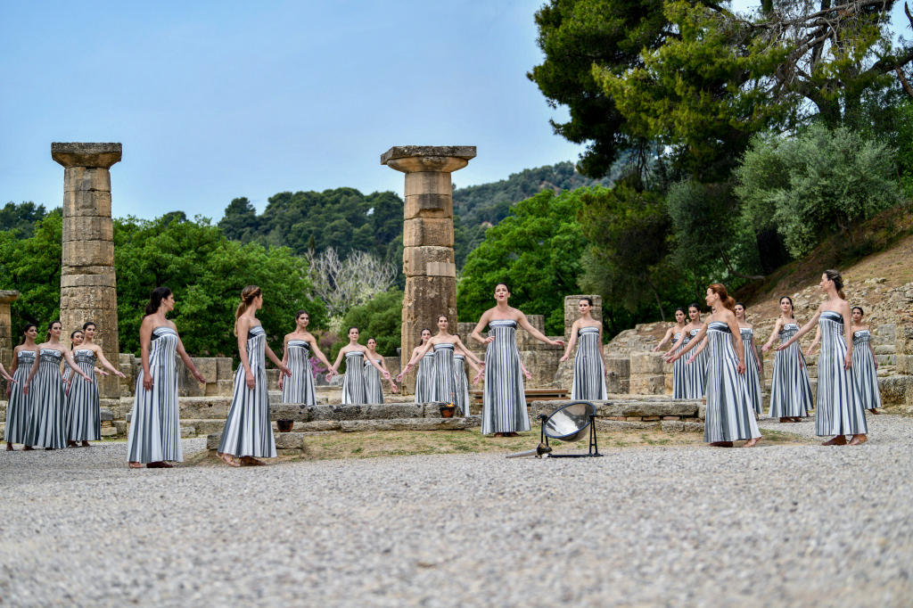 Μαγικές στιγμές προσέφεραν οι 35 ιέρειες και οι 15 κούροι με τις ενδυμασίες της διεθνούς φήμης σχεδιάστριας Μαίρης Κατράντζου, που πήραν μέρος στο τελετουργικό με τίτλο «Θρόισμα της Ιεράς Σιωπής», που εμπνεύστηκε η χορογράφος Άρτεμις Ιγνατίου υπό τη μουσική του καταξιωμένου συνθέτη, Δημήτρη Παπαδημητρίου. Tον Ολυμπιακό ύμνο ερμήνευσε η διάσημη Αμερικανίδα μια μέτζο σοπράνο, Τζόις Ντιντονάτο, ενώ τους Ολυμπιακούς κύκλους σχημάτισαν μαθητές των σχολείων του Δήμου Αρχαίας Ολυμπίας, μπροστά σε περισσότερους από 10.000 θεατές που κατέκλυσαν το αρχαίο στάδιο.