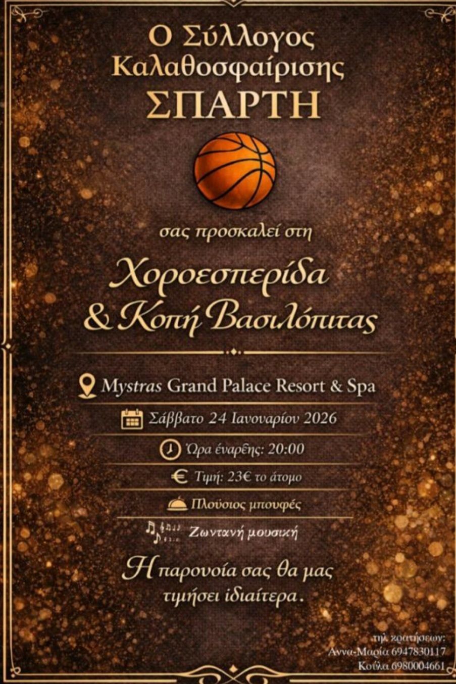 Σε μια βραδιά αθλητικού παλμού και εορταστικής διάθεσης, ο Σύλλογος Καλαθοσφαίρισης Σπάρτης προσκαλεί φίλους, αθλητές και υποστηρικτές του στη φετινή του χοροεσπερίδα και κοπή βασιλόπιτας, το Σάββατο 24 Ιανουαρίου, σ’ έναν από τους πιο φιλόξενους χώρους της πόλης, το Mystras Grand Palace Resort & Spa.