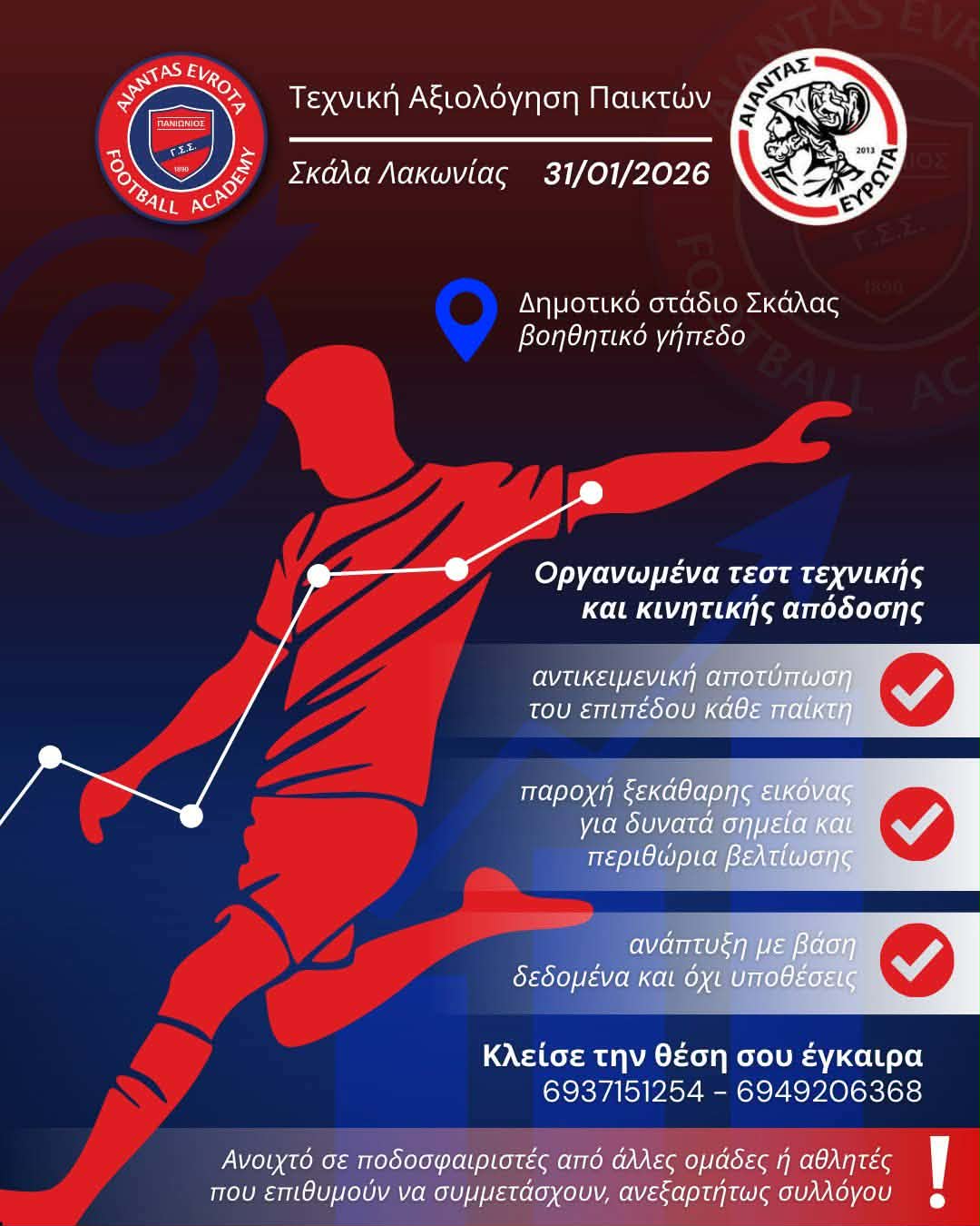 Το Σάββατο 31 Ιανουαρίου, στο Δημοτικό Στάδιο Σκάλας (βοηθητικό γήπεδο), θα πραγματοποιηθεί οργανωμένη τεχνική και κινητική αξιολόγηση, προσφέροντας σε κάθε συμμετέχοντα μια αντικειμενική εκτίμηση του επιπέδου του και των δυνατών του σημείων.
