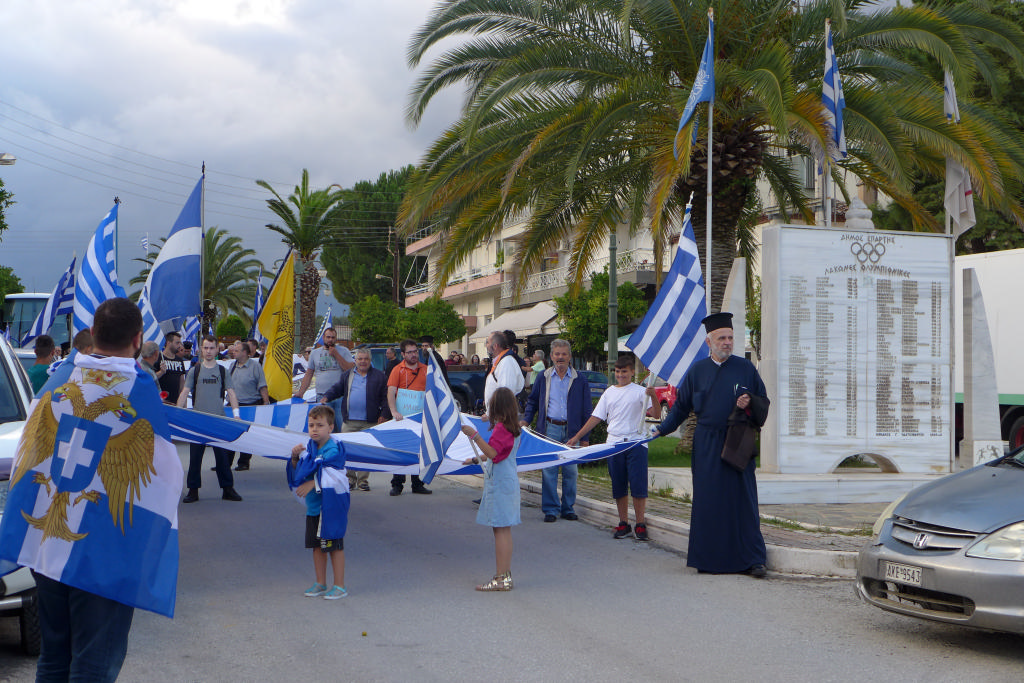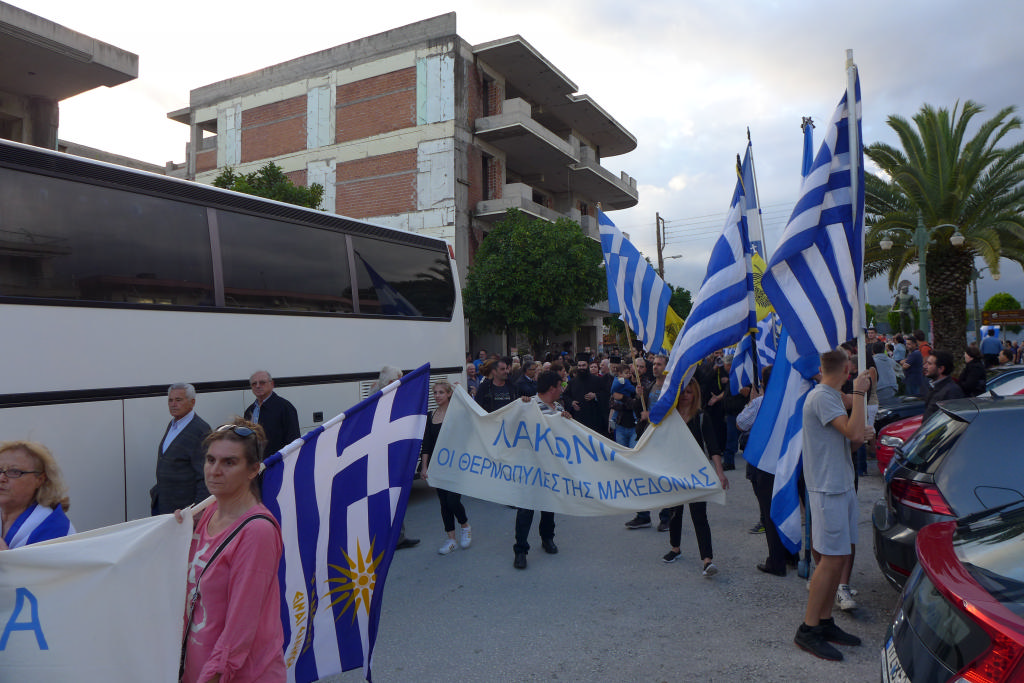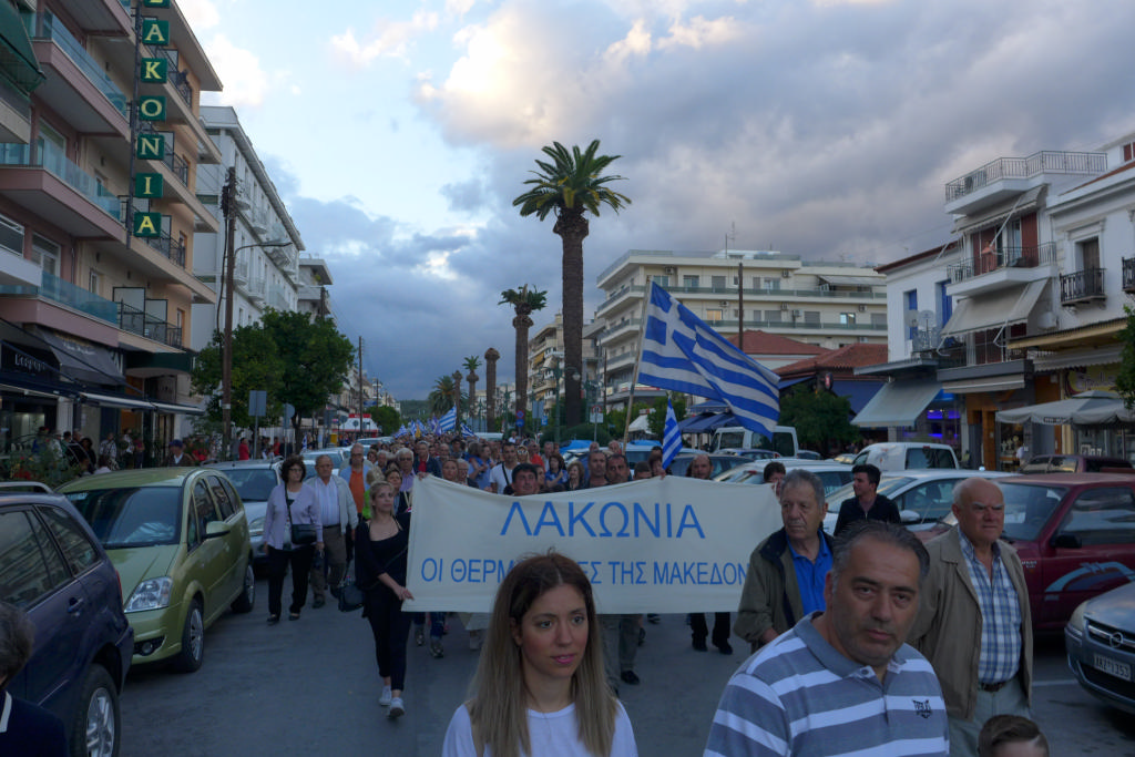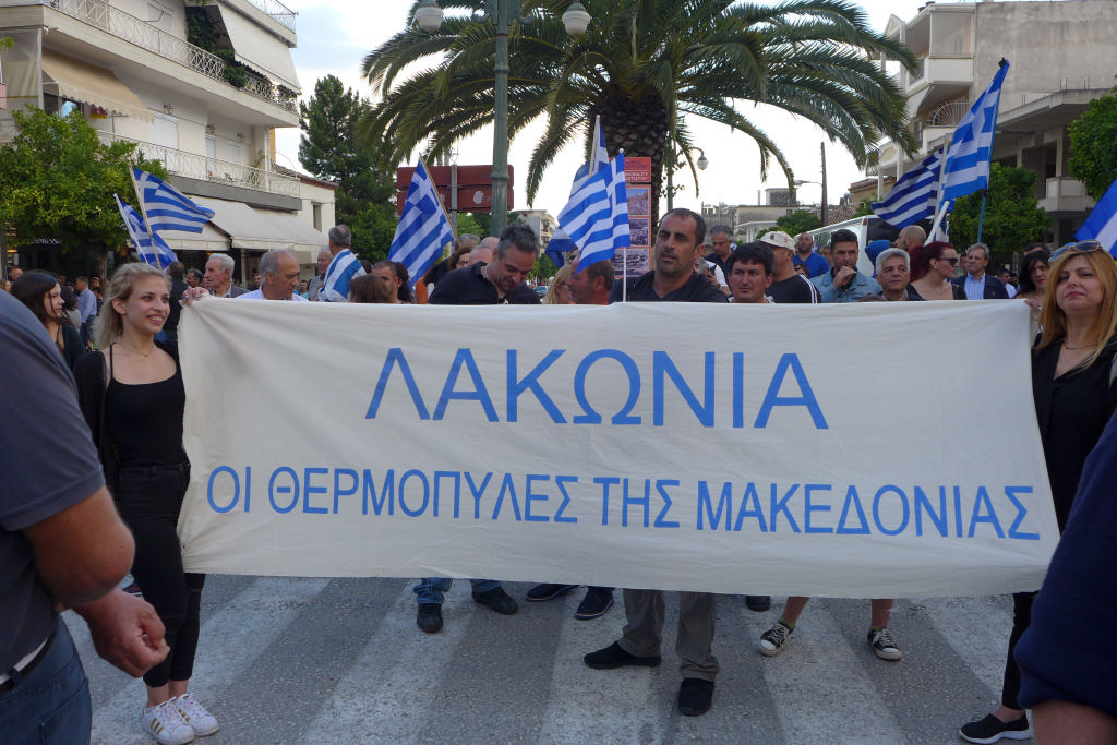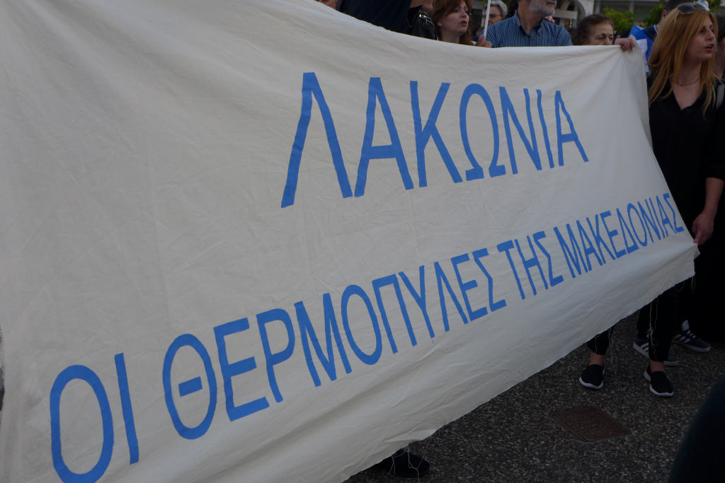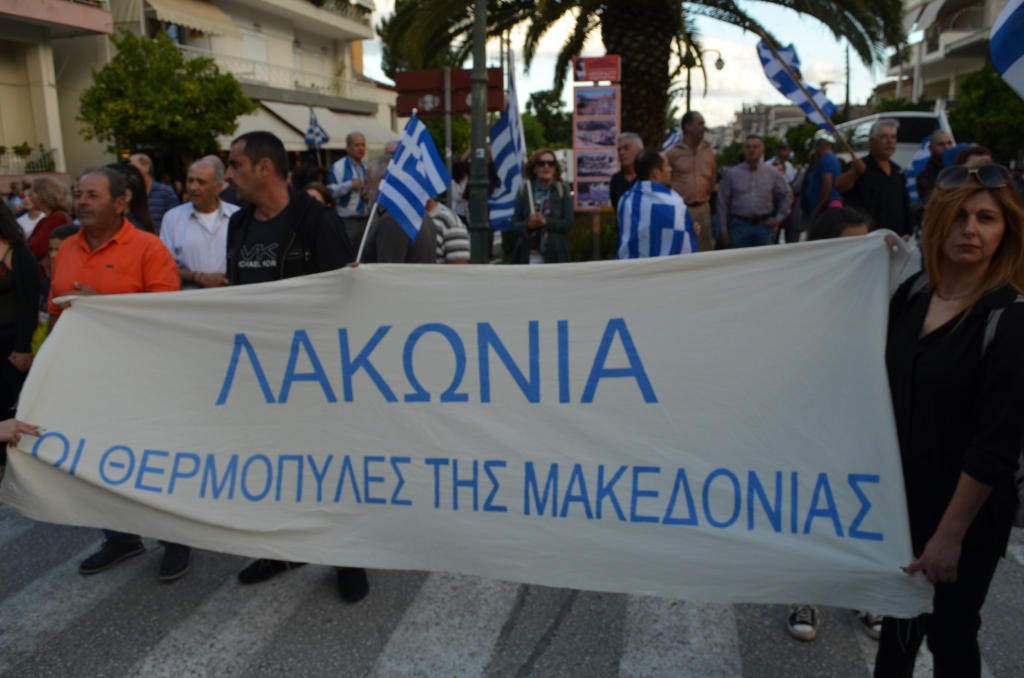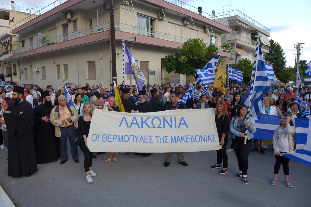 Με συνθήματα όπως «Ελλάς-Ελλάς, ή ταν ή επί τας», «σάς το φωνάζει η Σπάρτη και όλη η Λακωνία, κάτω τα χέρια απ' τη Μακεδονία», τραγούδια όπως το «Μακεδονία ξακουστή», με σημαίες και πανό ανά χείρας όπου αναγράφονταν φράσεις όπως «Λακωνία: Οι Θερμοπύλες της Μακεδονίας», εκατοντάδες Σπαρτιάτες, αλλά και πολίτες από διάφορες περιοχές της Λακωνίας, διαδήλωσαν το απόγευμα της Πέμπτης (28/6) στη Σπάρτη ενάντια στη συμφωνία για τη Μακεδονία.