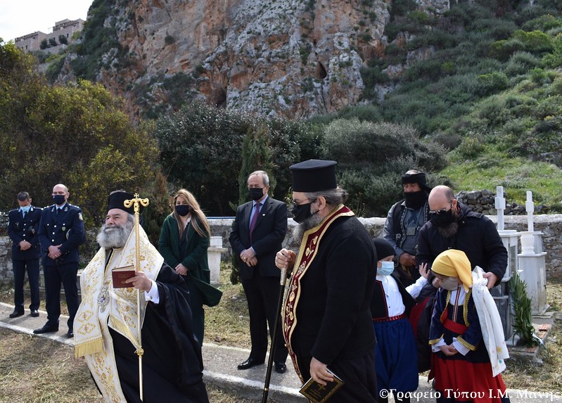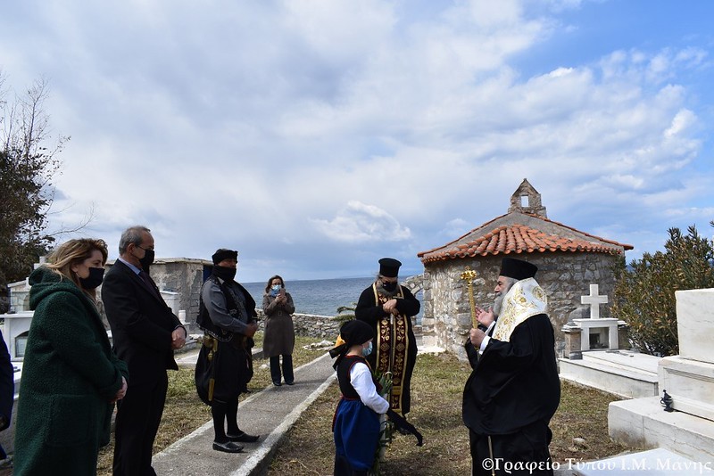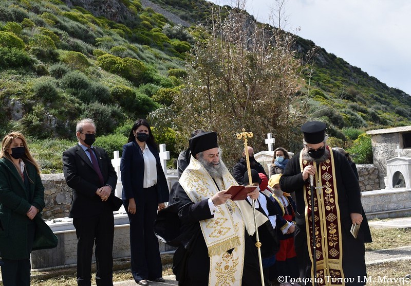 Ακολούθως ο Μητροπολίτης Μάνης, μετέβη στο Κοιμητήριου Αγίου Σώζοντος στο Λιμένι, όπου ενώπιον της προτομής του αντιστράτηγου ήρωα Πετρόμπεη Μαυρομιχάλη, τέλεσε τρισάγιο υπέρ αναπαύσεως της ψυχής του.