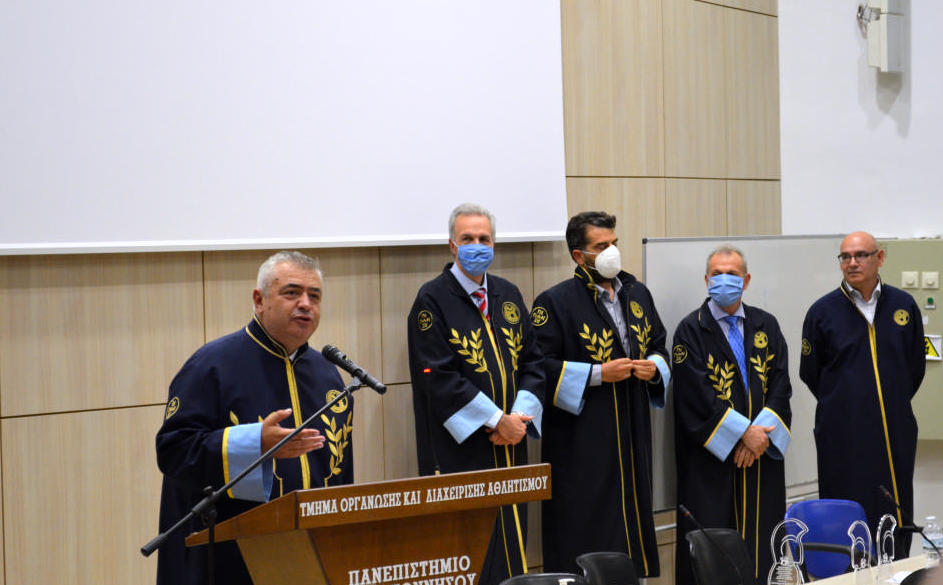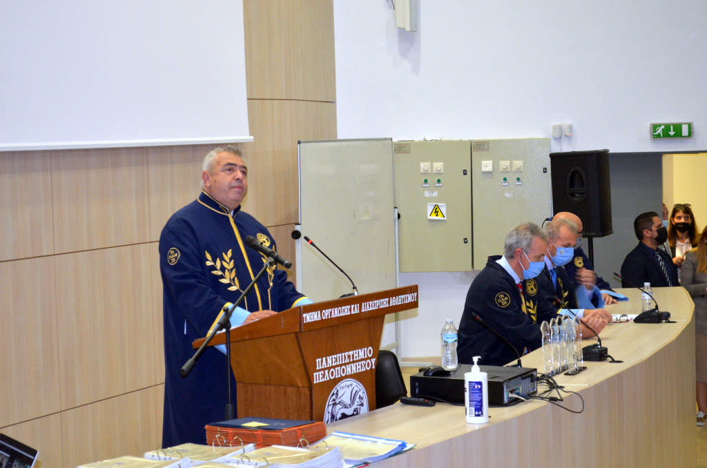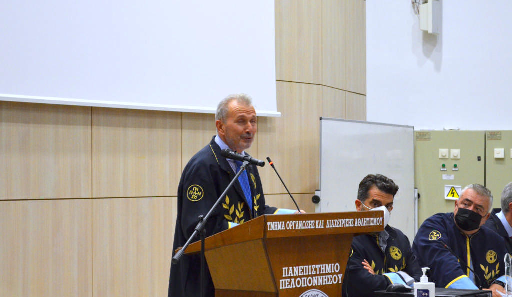 Διαδοχικά χαιρέτισαν τους αποφοίτους ο πρύτανης του Πανεπιστημίου Πελοποννήσου Αθανάσιος Κατσής, ο οποίος μεταξύ άλλων εξέφρασε την ιδιαίτερη τιμή και χαρά του για την εκπροσώπηση -έπειτα από 14 χρόνια- του Υπουργείου Παιδείας και Θρησκευμάτων στην τελετή μέσω της παρουσίας του υφυπουργού. Στη συνέχεια, ο κ. Κατσής βράβευσε τη φοιτήτρια του τμήματος, Αντιγόνη Ντρισμπιώτη, η οποία ήταν 8ης Ολυμπιονίκης του Τόκιο στο βάδην. Από την πλευρά του ο Κοσμήτορας της Σχολής Επιστημών Ανθρώπινης Κίνησης και Ποιότητας Ζωής, Παναγιώτης (Τάκης) Αλεξόπουλος, βράβευσε τον προπονητή της Ολυμπιονίκη, Ναπολέων Κεφαλλόπουλο, ενώ ευχαρίστησε τους επίσημους προσκεκλημένους για την παρουσία τους και τη συμμετοχή τους στην τελετή καθομολόγησης των αποφοίτων. Ο ίδιος τόνισε ότι το τμήμα «συνδυάζει με επιτυχία τη θεωρία με την πράξη, αφού η διοίκηση του αθλητισμού είναι μία κατεξοχήν εφαρμοσμένη επιστήμη η οποία υλοποιεί με απόλυτη συνέπεια τις αρχές των πιο σύγχρονων θεωριών στη διοίκηση, την ψυχολογία, την οικονομία και τις επιστήμες υγείας και με πνεύμα εξωστρέφειας και καινοτομίας συνεχίζει καθημερινά να επενδύει στην ανάπτυξη εκπαιδευτικών και ερευνητικών προγραμμάτων σε συνεργασία με πανεπιστήμια αλλά και στρατηγικούς εταίρους, εστιάζοντας στην επαγγελματική́ σταδιοδρομία των φοιτητών και των φοιτητριών σε εθνικό αλλά και σε διεθνές επίπεδο.»