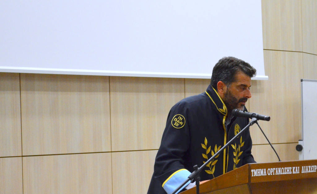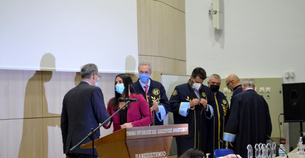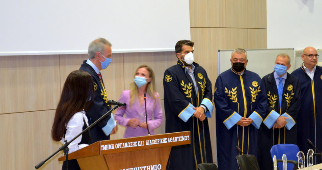 Στο πλαίσιο της τελετής, ο υφυπουργός βράβευσε για την προσφορά της στον αθλητισμό, την 7η Ολυμπιονίκη του Τόκιο στο τζούντο, Ελισάβετ Τελτσίδου, ενώ εξέφρασε τη χαρά του για την παρουσία του στην ορκωμοσία των αποφοίτων. Χαρακτήρισε το ΤΟΔΑ «μοναδικό πανεπιστημιακό τμήμα που μελετά έναν κλάδο ο οποίος είναι ταχύτατα εξελισσόμενος σε παγκόσμιο επίπεδο, ενώ δίνει στους αποφοίτους σημαντικές προοπτικές ανέλιξης και επαγγελματικής αποκατάστασης.»