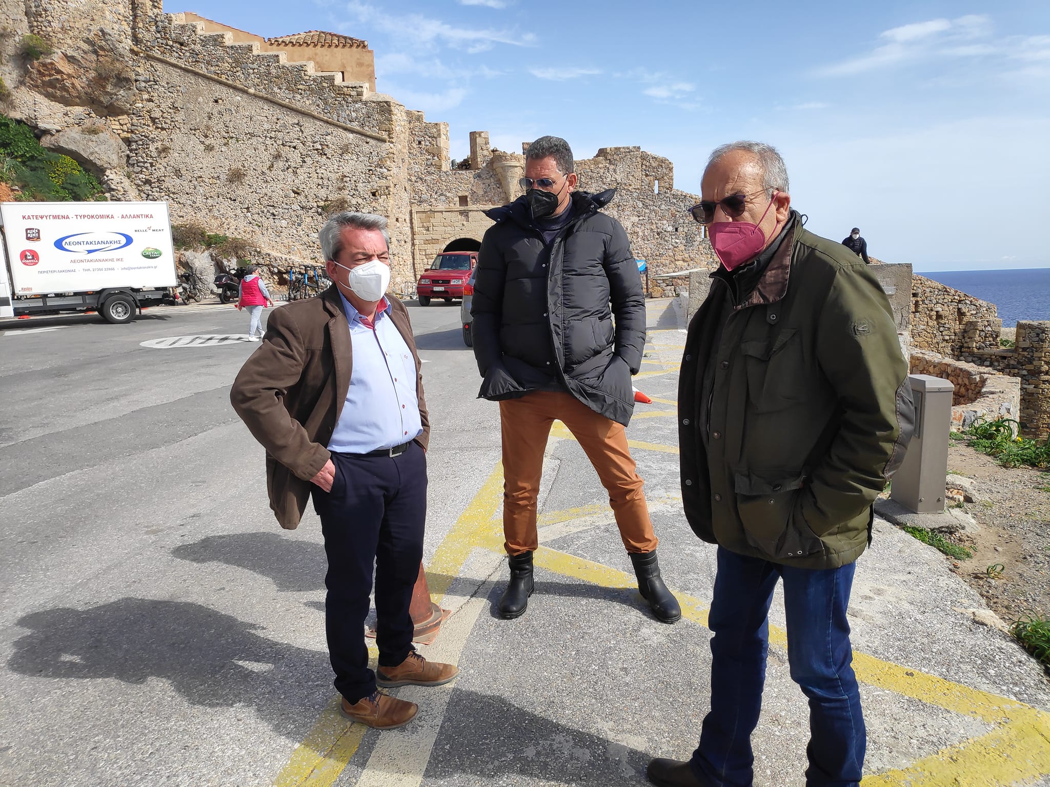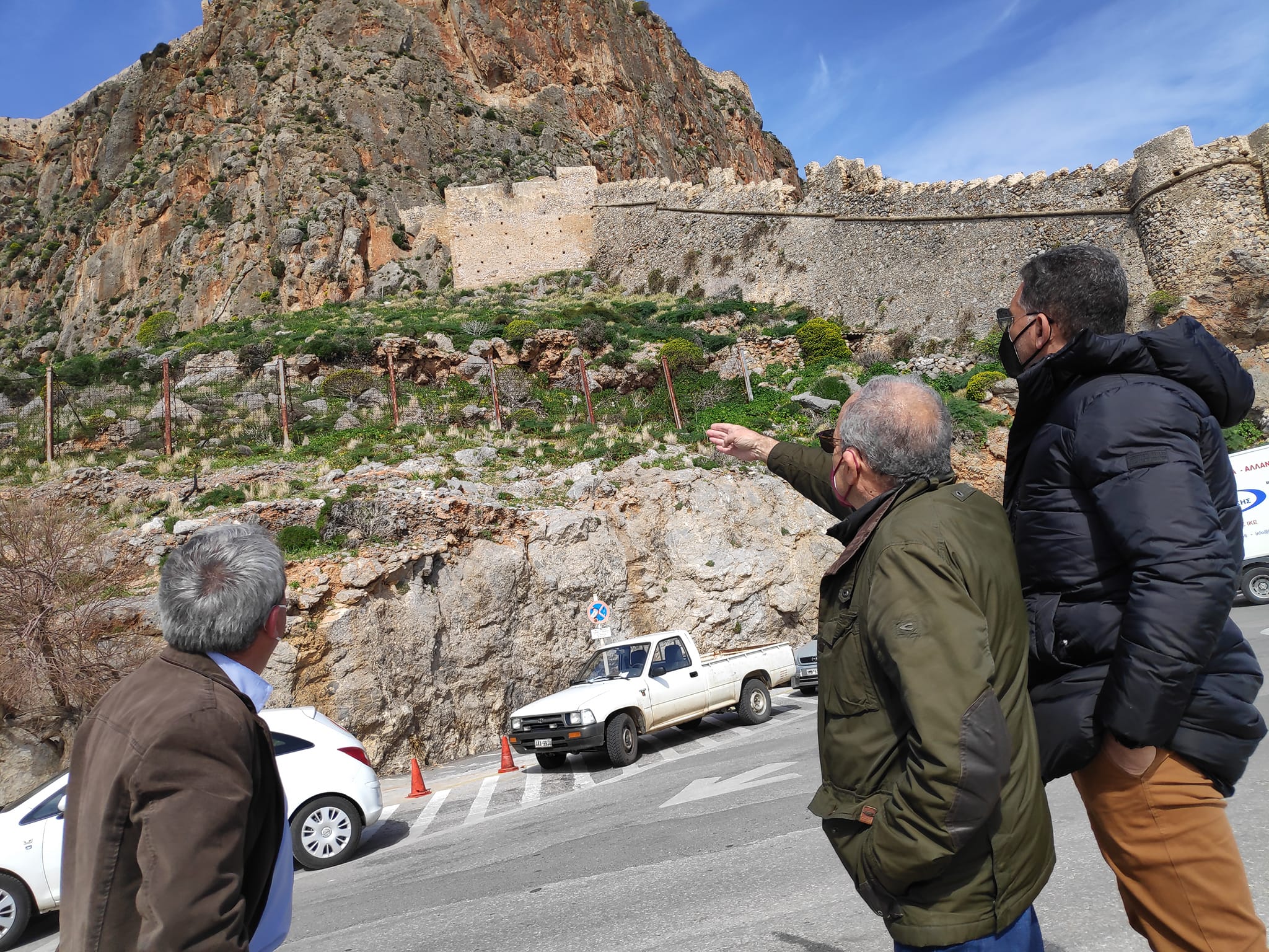 Στη συνέχεια, στην είσοδο του κάστρου Μονεμβασίας, τα στελέχη της Αυτοδιοίκησης συζήτησαν για όλα τα έργα που πρόκειται να υλοποιηθούν στην διαδρομή «Γέφυρα - Πύλη Κάστρου» και ειδικότερα για τη μελέτη ανάπλασης της διαδρομής.