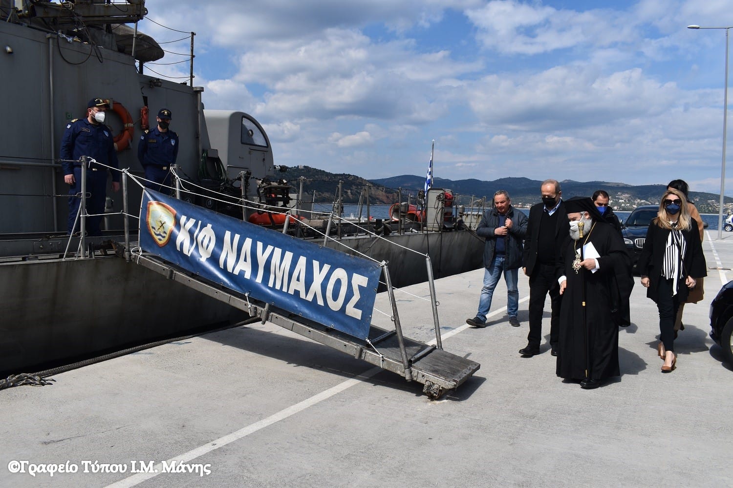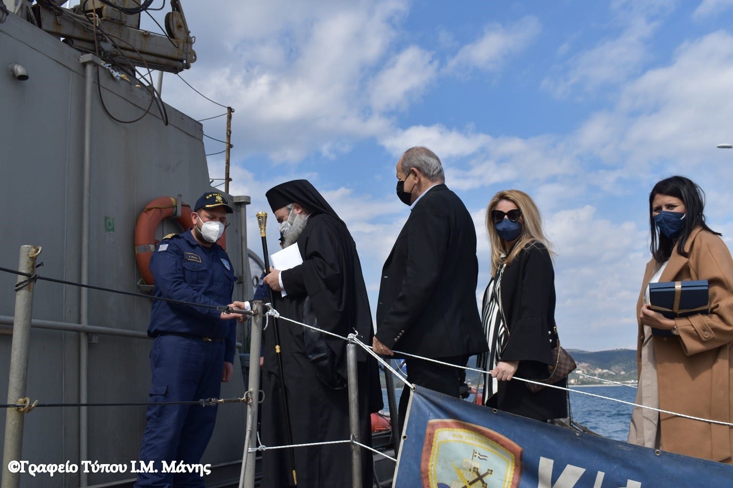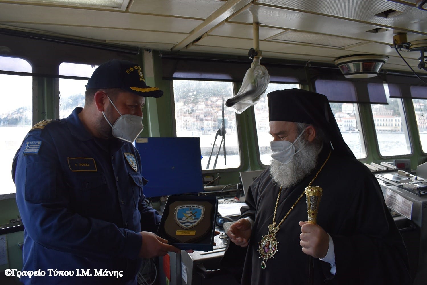 Ο Μητροπολίτης, συνοδευόμενος από τον δήμαρχο Ανατολικής Μάνης Πέτρο Ανδρεάκο, την πρόεδρο του Δημοτικού Συμβουλίου Γεωργία Λυροφώνη και την αντιδήμαρχο Ελένη Δρακουλάκου, έγινε δεκτός από τον κυβερνήτη του πλοίου, Πλωτάρχη Γ. Ρόκα.