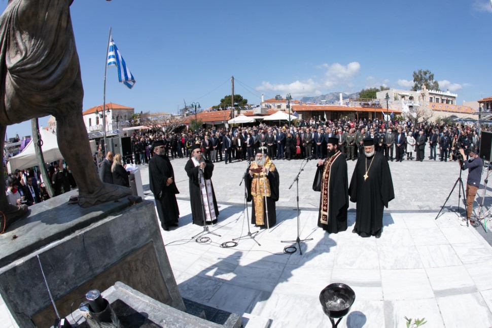 Ως έθνος οφείλουμε και σήμερα να είμαστε έτοιμοι να υπερασπιστούμε την πατρίδα μας έναντι οιασδήποτε απειλής. Γι’ αυτό ενισχύουμε τις Ένοπλες δυνάμεις της πατρίδας και ενισχύουμε τις αξιόπιστες σχέσεις στο πλαίσιο των συμμαχιών σε όλο τον κόσμο και στην Ευρώπη που μετέχει η Ελλάδα ως ισχυρή χώρα με αξιόπιστη πολιτική.» Υποστήριξε ακόμη ο κ. Θεοδωρικάκος ότι «η ενότητα των Ελλήνων είναι η δύναμή μας. Μόνο ενωμένοι μπορούμε να αντιμετωπίσουμε κάθε δυσκολία που θα βρούμε μπροστά μας. Είμαστε πολύ λίγοι για να είμαστε διχασμένοι.» Έκλεισε λέγοντας πως «όλοι θέλουμε να πετύχουμε μια σταθερή ειρήνη στην περιοχή μας, η οποία είναι προϋπόθεση για την πρόοδο και την ευημερία. Γι' αυτό το λόγο οφείλουμε να έχουμε –και έχουμε– εθνική στρατηγική, σταθερό χέρι στο πηδάλιο της χώρας, σωστό προσανατολισμό στην πυξίδα του καραβιού της Πατρίδας και ενότητα. Αυτές είναι οι προϋποθέσεις που πρέπει να έχουμε και τις έχουμε. Θα ξεπεράσουμε γι' αυτό κάθε δυσκολία, κάθε δοκιμασία, εμπνεόμενοι πάντα από το κουράγιο, τη δύναμη, τον πατριωτισμό, τη θυσία των προγόνων μας σε τούτη εδώ τη γη πριν από 201 χρόνια.»