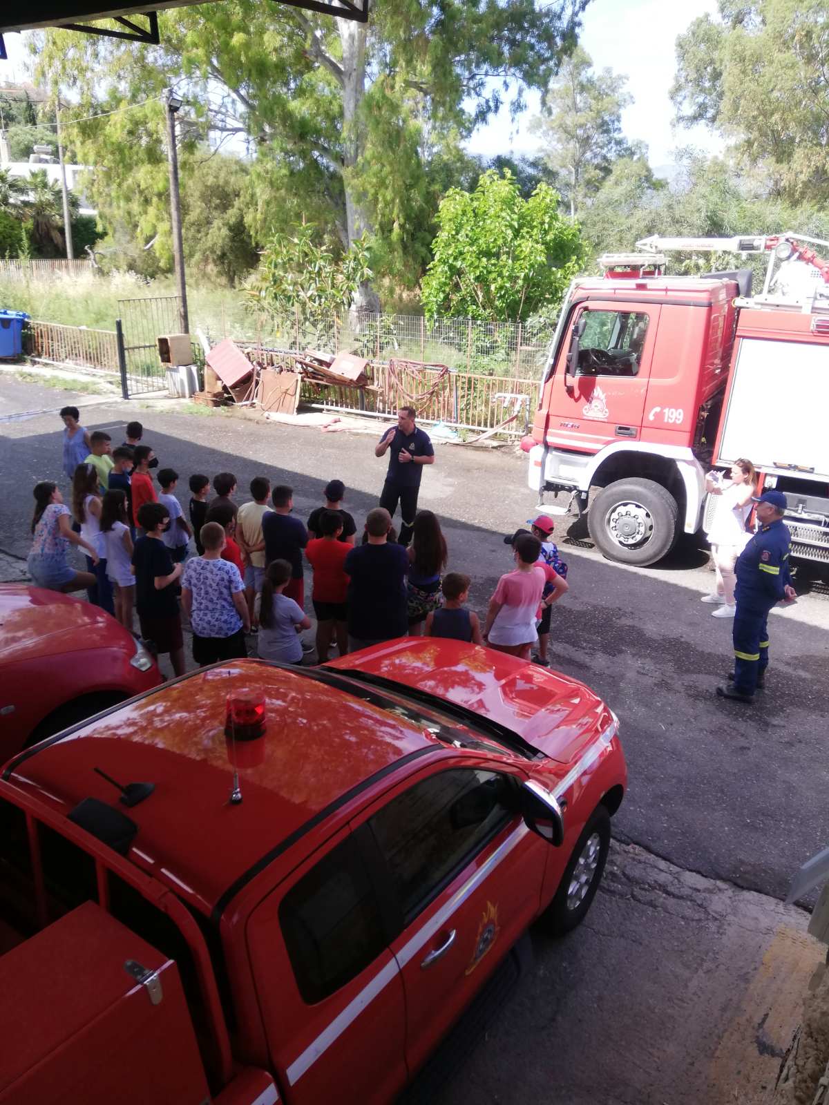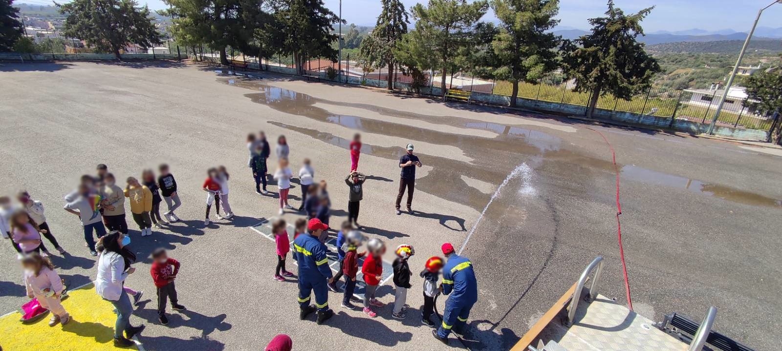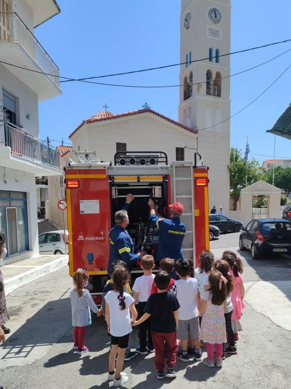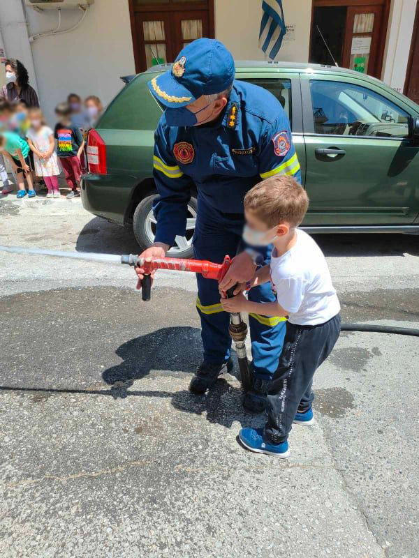 Τέλος, οι μαθητές ξεναγήθηκαν στα μέρη του πυροσβεστικού οχήματος και αισθάνθηκαν με ενθουσιασμό για λίγο ως «ήρωες πυροσβέστες» κρατώντας τον πυροσβεστικό αυλό.