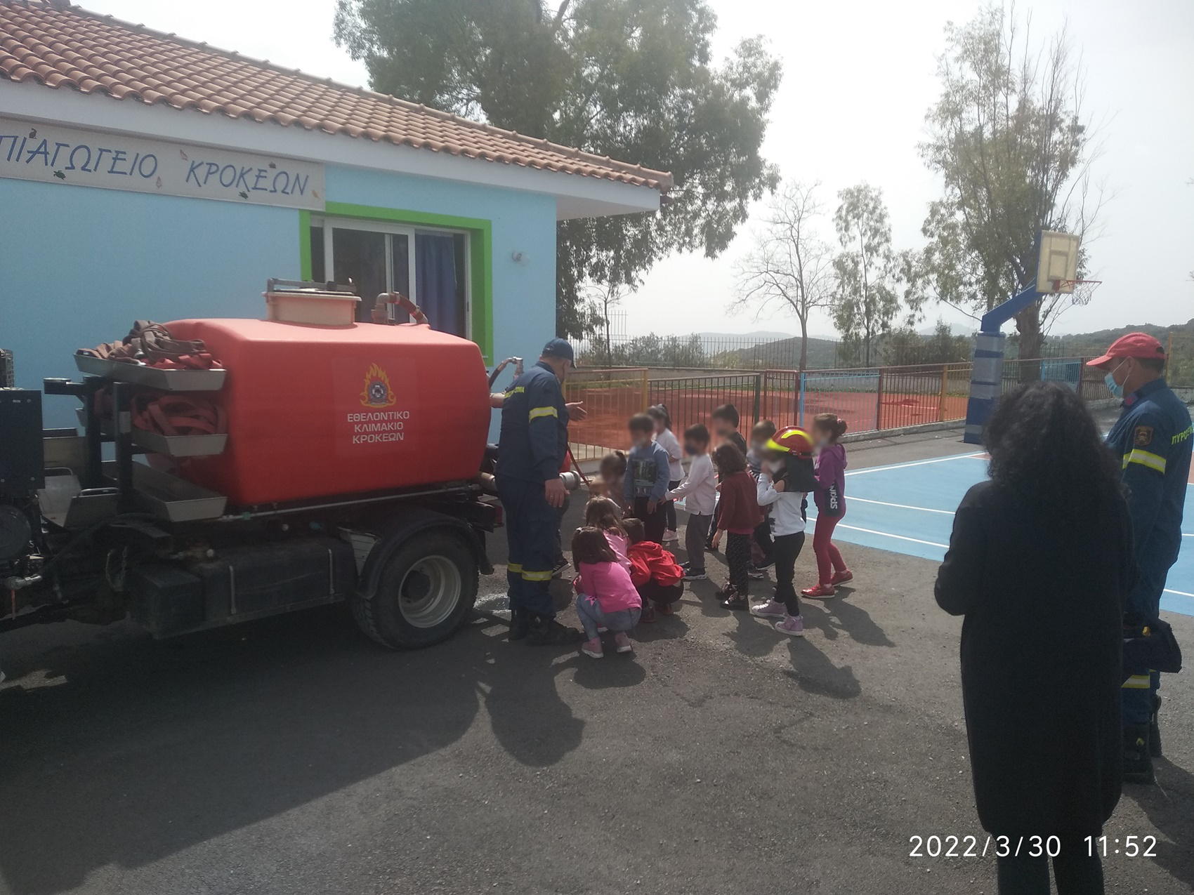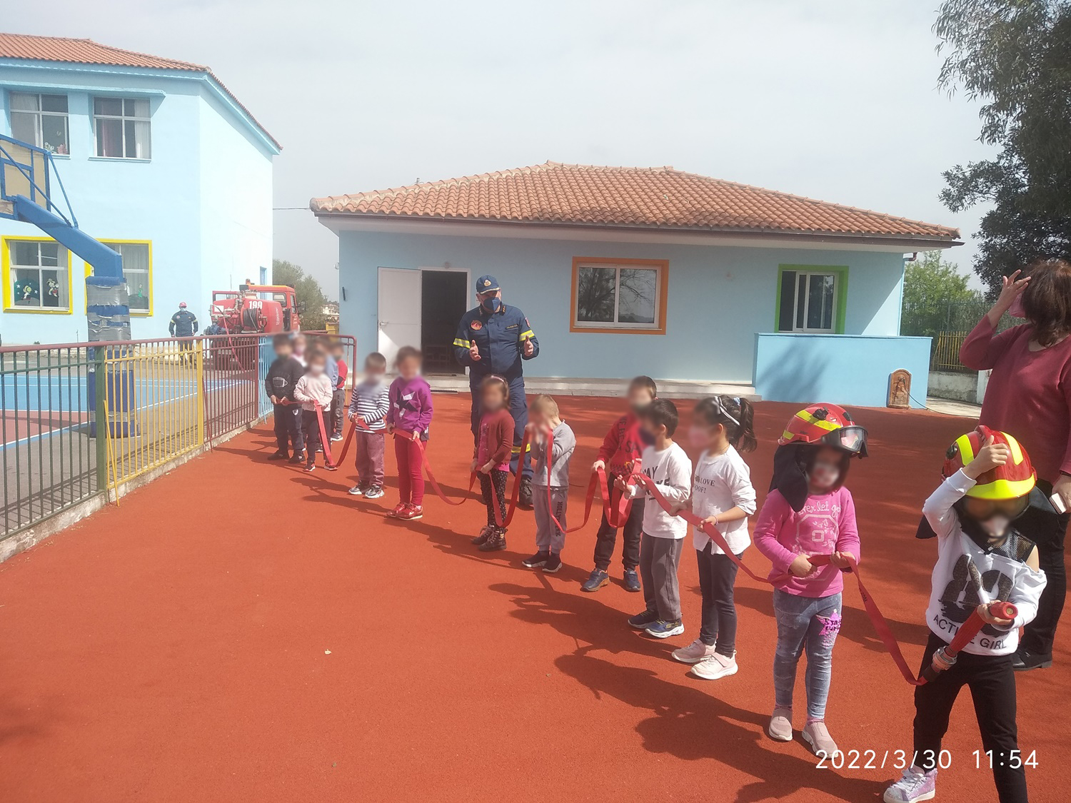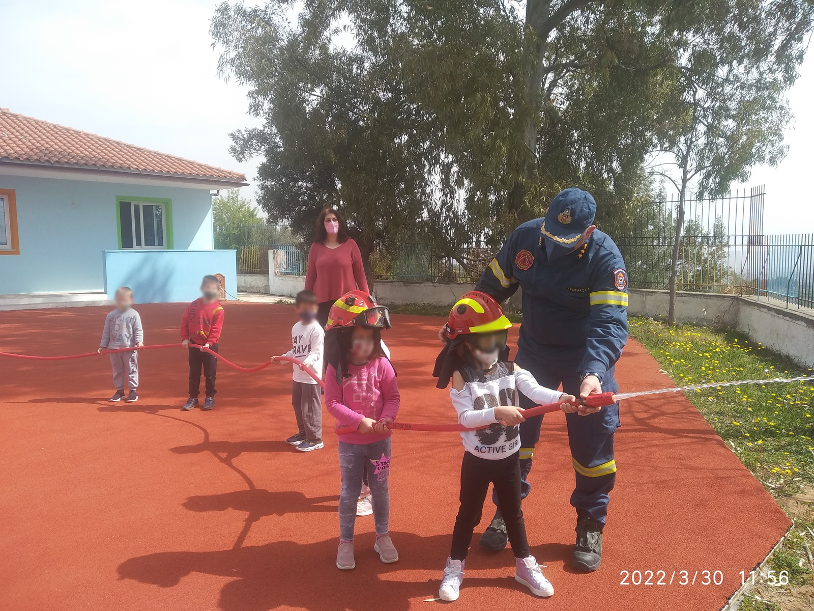 Τέλος, οι μαθητές ξεναγήθηκαν στα μέρη του πυροσβεστικού οχήματος και αισθάνθηκαν με ενθουσιασμό για λίγο ως «ήρωες πυροσβέστες» κρατώντας τον πυροσβεστικό αυλό.