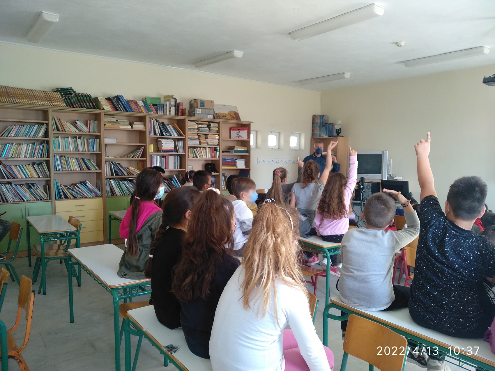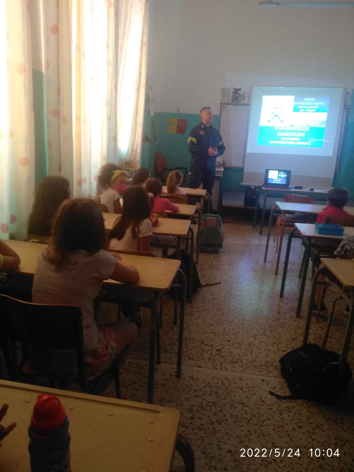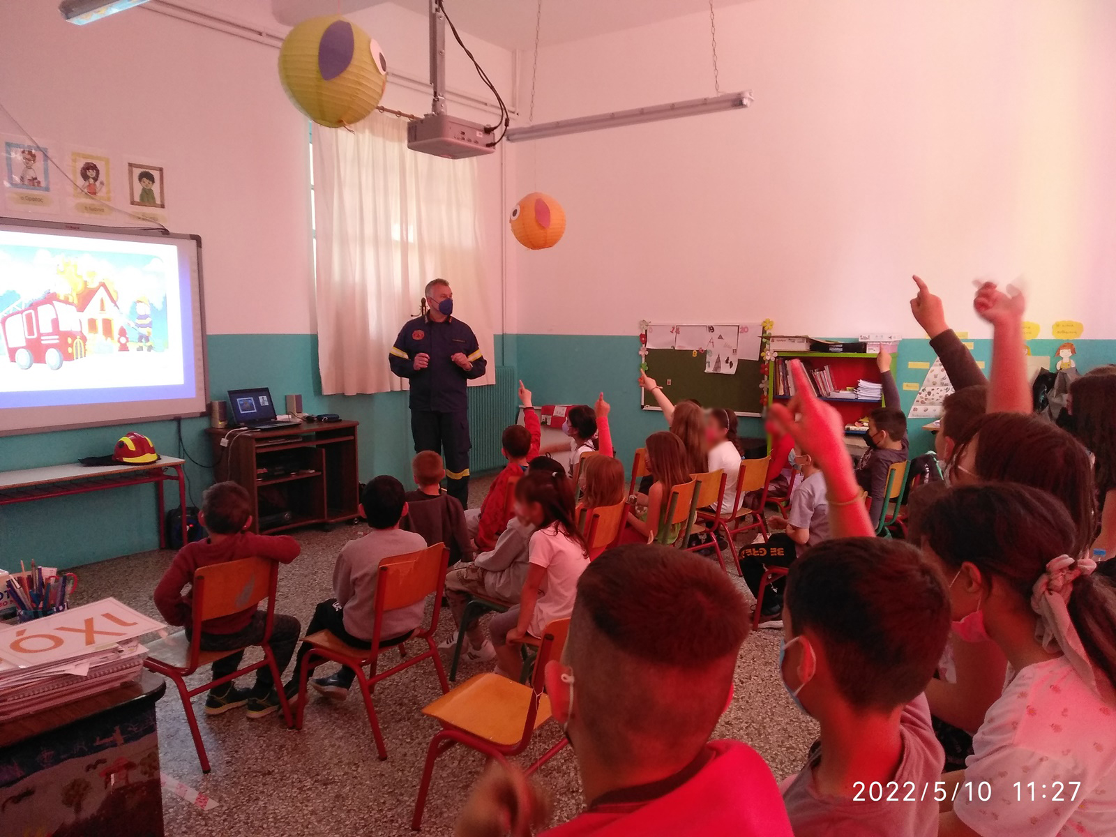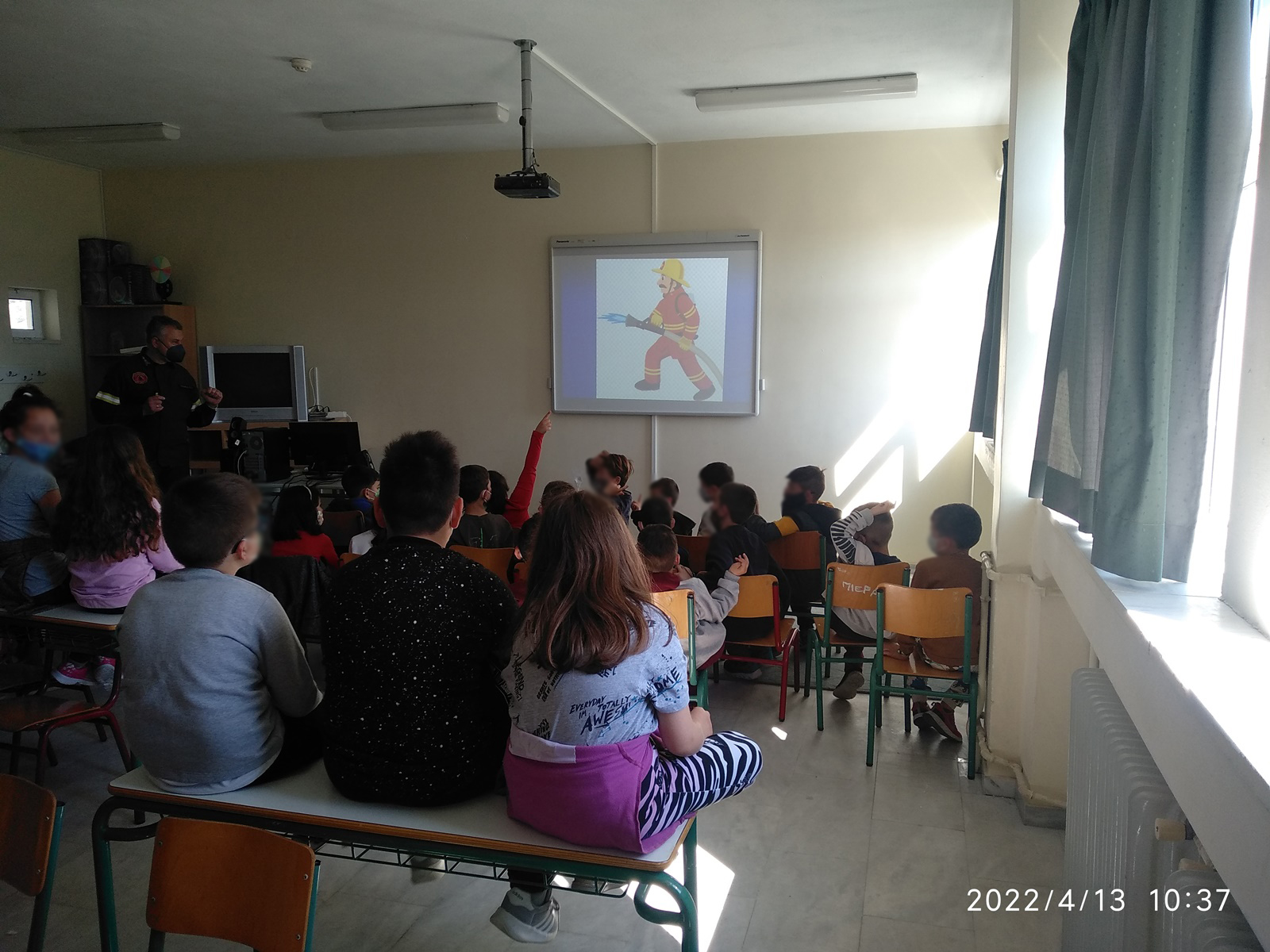 Στη συνέχεια, και για την καλύτερη προσέγγιση των ελληνικών δεδομένων του Πυροσβεστικού Σώματος, παρακολούθησαν φωτογραφικό υλικό με πυροσβεστικά μέσα ξηράς, αέρα και θαλάσσης, πυροσβεστικό εξοπλισμό, μέσα ατομικής προστασίας και τον αριθμό 199. Παράλληλα με την εναλλαγή των εικόνων, ο εκπαιδευτής περιέγραφε τις εικόνες, κάνοντας κατά τη ροή της ενημέρωσης και ερωτήσεις αντίστοιχες με την εικόνα, ώστε οι μαθητές να συμμετέχουν με απαντήσεις κι έτσι να διατηρείται αμείωτο το ενδιαφέρον.