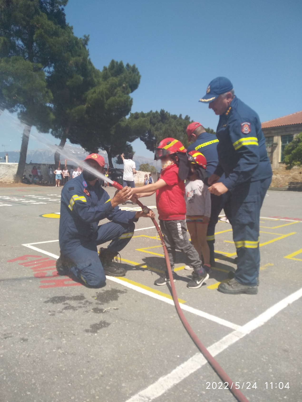 Στο διαδραστικό μέρος της ενημέρωσης όλοι οι μαθητές, αφού ενημερώθηκαν για τα υλικά και τα εξαρτήματα του πυροσβεστικού οχήματος, με την βοήθεια του πληρώματος του Π.Ο. ανέπτυξαν εγκατάσταση νερού χαμηλής πίεσης και έριξαν νερό.