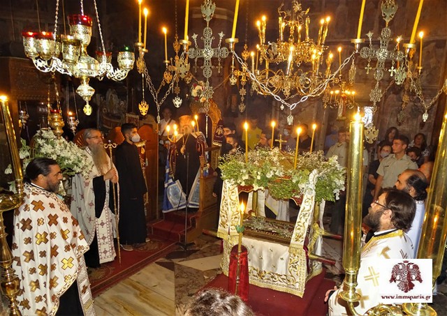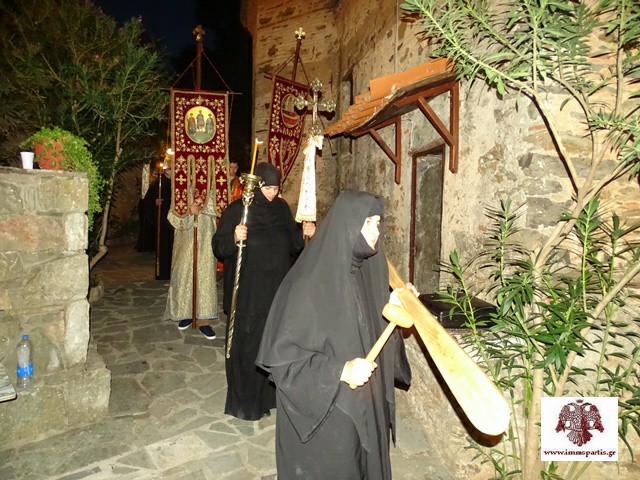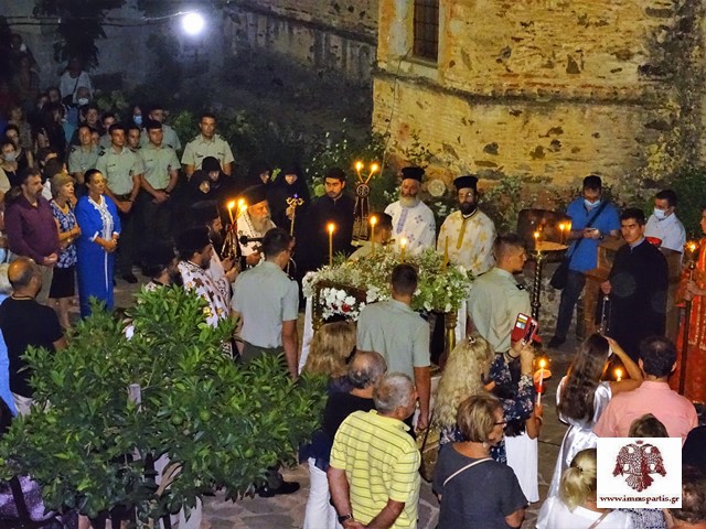 Ακολούθησε, σε κλίμα κατάνυξης, η περιφορά του επιταφίου της Παναγίας πέριξ του καθολικού.