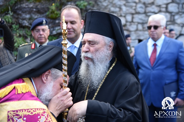 Αρχικά, ο σεπτός Ποιμενάρχης της Σπάρτης παρέδωσε την ποιμαντορική ράβδο στον νέο Μητροπολίτη και στη συνέχεια σχηματίσθηκε πομπή, η οποία -προπορευομένης της Φιλαρμονικής και συνοδεία στρατιωτικού αγήματος- έφτασε στην κεντρική πλατεία, όπου ο δήμαρχος Γορτυνίας προσφώνησε τον νέο Μητροπολίτη.
