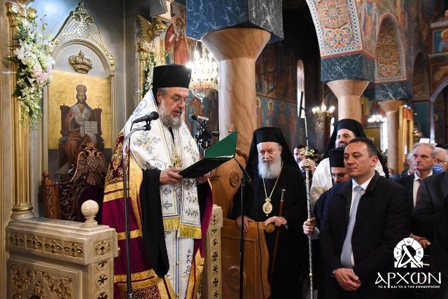 Ακολούθως, έγινε μετάβαση στον Μητροπολιτικό Ναό Αγίου Νικολάου, όπου τελέσθηκε η ακολουθία της ενθρονίσεως. O πρωτοσύγκελος της Μητρόπολης Γόρτυνος και Μεγαλοπόλεως ανέγνωσε την εγκύκλιο της Ιεράς Συνόδου και το προεδρικό διάταγμα περί εκλογής, αναγνωρίσεως και καταστάσεως του νέου Μητροπολίτη. Ακολούθησαν προσφωνήσεις του σεβασμιωτάτου Μητροπολίτη Μονεμβασίας και Σπάρτης, του πρωτοσύγκελου της οικείας Μητρόπολης και του περιφερειάρχη Πελοποννήσου κ. Παναγιώτη Νίκα. Ο ιερός κλήρος πρόσφερε στον Μητροπολίτη Νικηφόρο μια ποιμαντορική ράβδο και στον Μητροπολίτη Ευστάθιο ένα αρχιερατικό επιγονάτιο. Με τη σειρά του ο δήμαρχος Μεγαλόπολης, εκ μέρους του δήμου, πρόσφερε στον νέο Μητροπολίτη ένα σετ σταυροεγκολπίου.