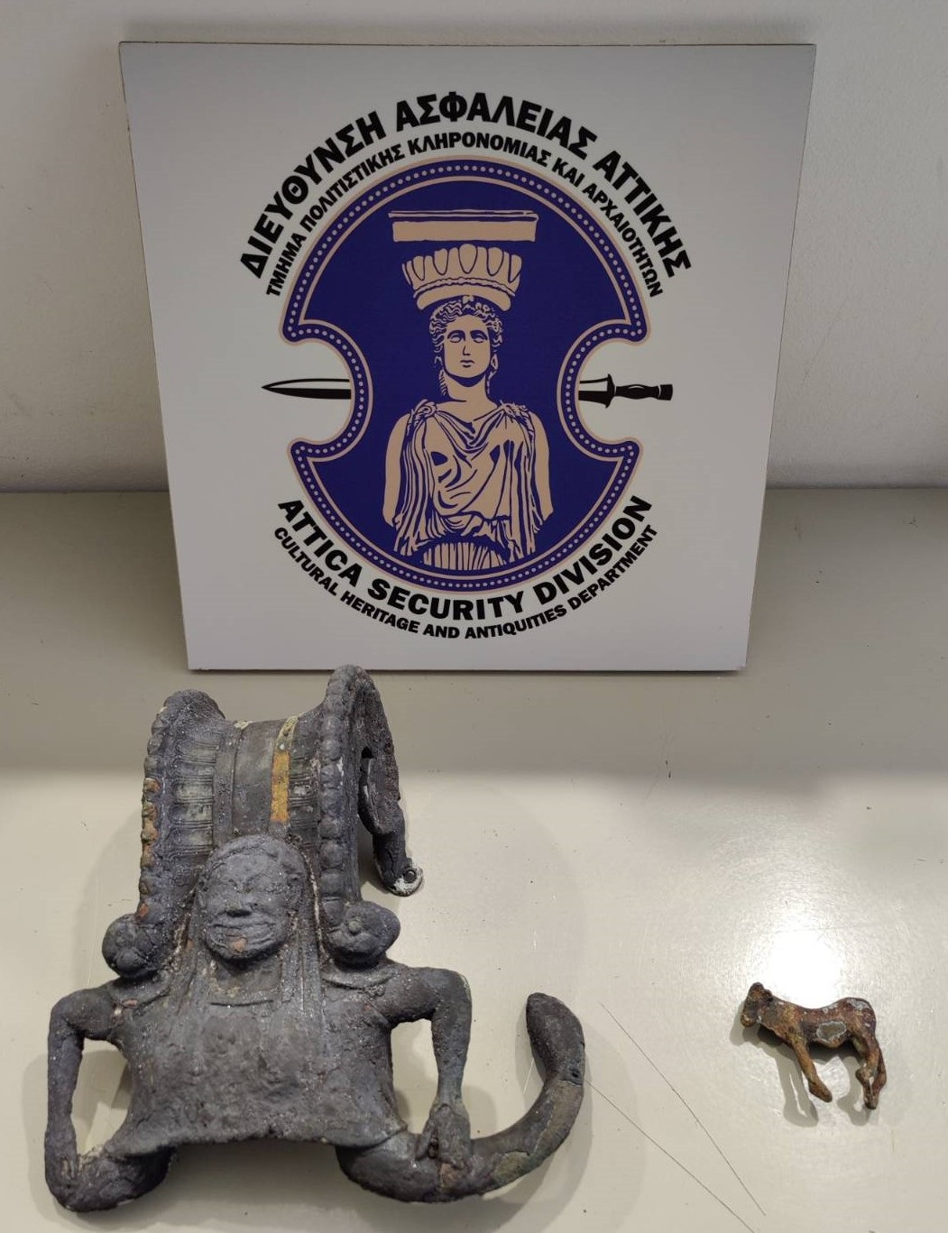 Συγκεκριμένα, ο 56χρονος εντοπίστηκε από τους αστυνομικούς τις μεσημβρινές ώρες του Σαββάτου (19/11) εντός αυτοκινήτου στη Σπάρτη. Μετά από έρευνα -εντός του οχήματος και συγκεκριμένα κάτω από τη θέση του συνοδηγού- βρέθηκαν μέσα σε μία σακούλα και κατασχέθηκαν: χάλκινο ειδώλιο ζώου αρχαίων χρόνων και τμήμα χάλκινης επίθετης λαβής από μεγάλο ανοιχτό αγγείο, με μορφή μετωπικής μέδουσας.