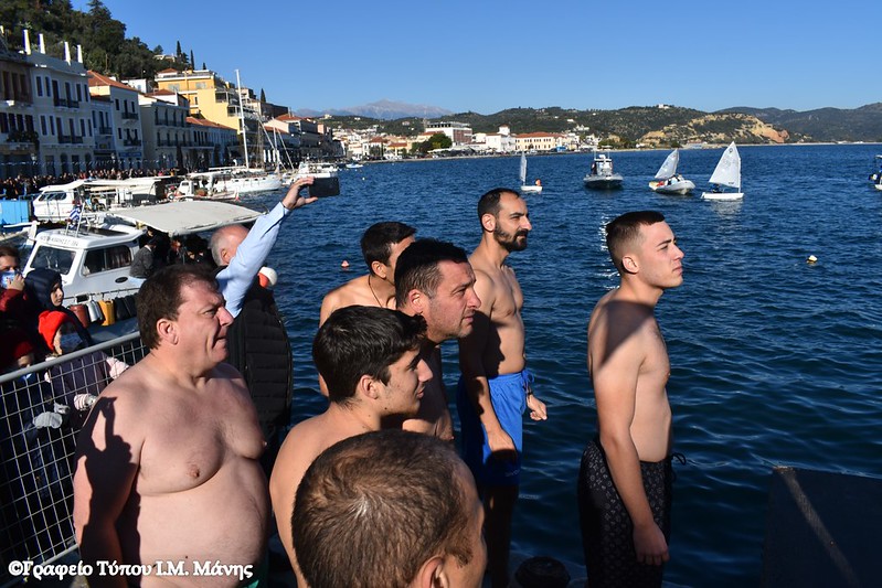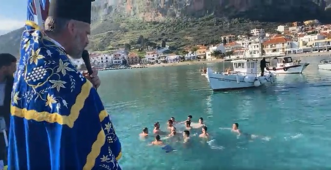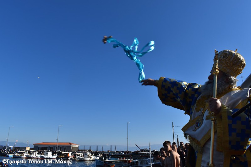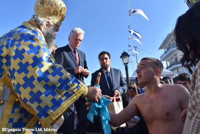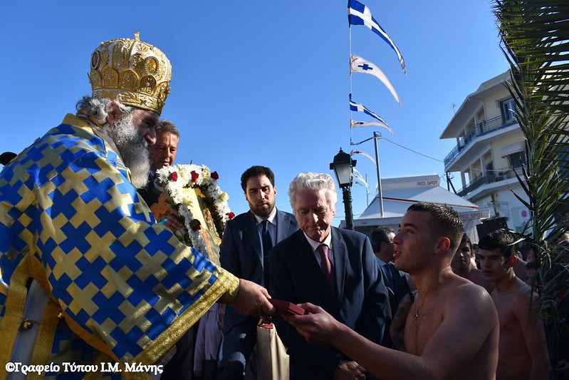 Στη συνέχεια σχηματίστηκε λιτανευτική πομπή που, υπό τους ήχους της Φιλαρμονικής του Δήμου Ανατολικής Μάνης, κατευθύνθηκε προς την αποβάθρα του λιμένα, όπου πραγματοποιήθηκε η κατάδυση του Τιμίου Σταυρού και ο καθαγιασμός των υδάτων. Στη θάλασσα βούτηξαν 14 κολυμβητές, γεμάτοι πίστη και ενθουσιασμό που έλαβαν την ευλογία του Σταυρού από τα χέρια του Μητροπολίτη Χρυσοστόμου Γ’. Τον Τίμιο Σταυρό ανέσυρε ο νέος αγρότης, που υπηρετεί αυτή την περίοδο τη στρατιωτική του θητεία, Παναγιώτης Μαστοράκος.