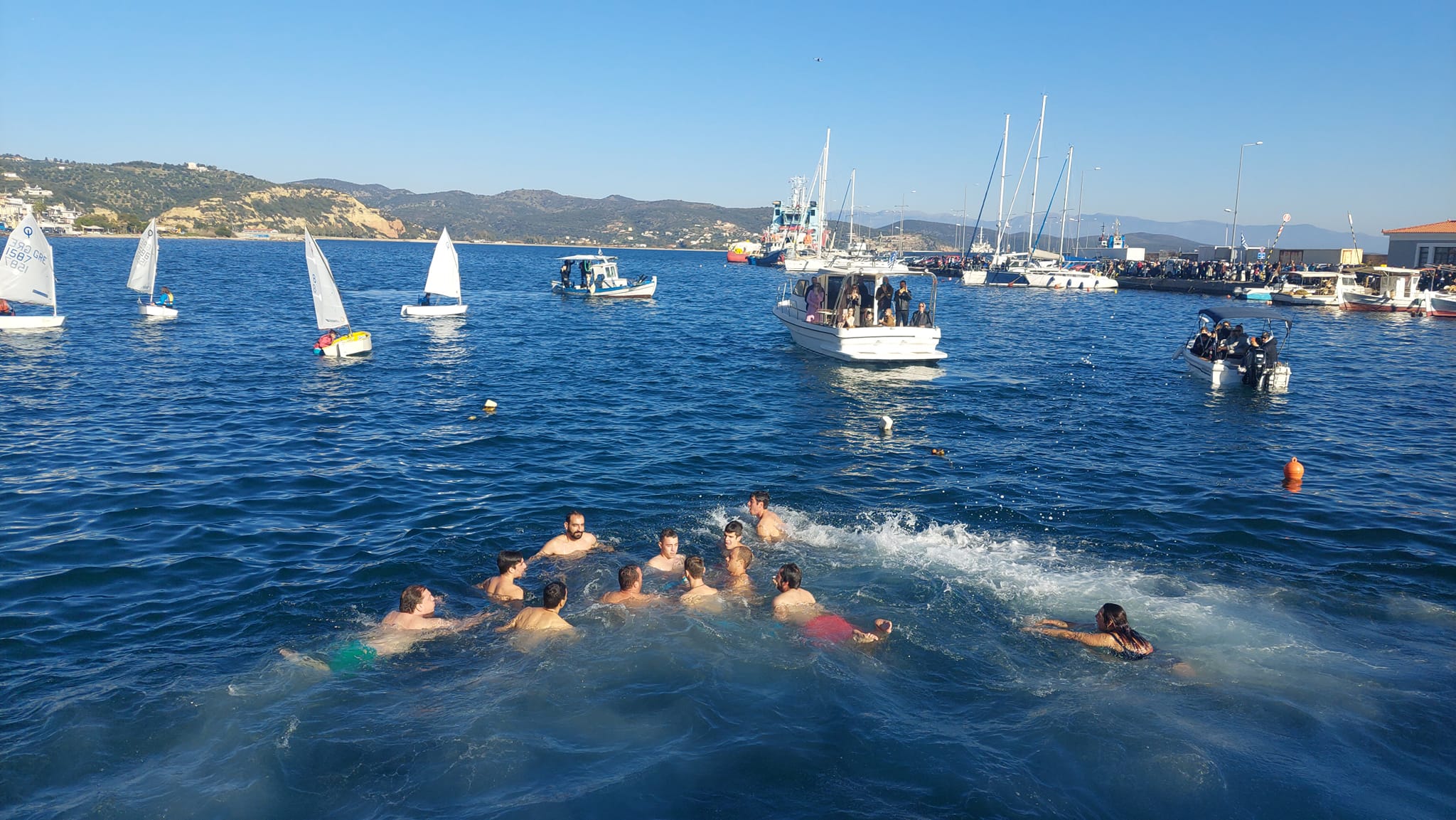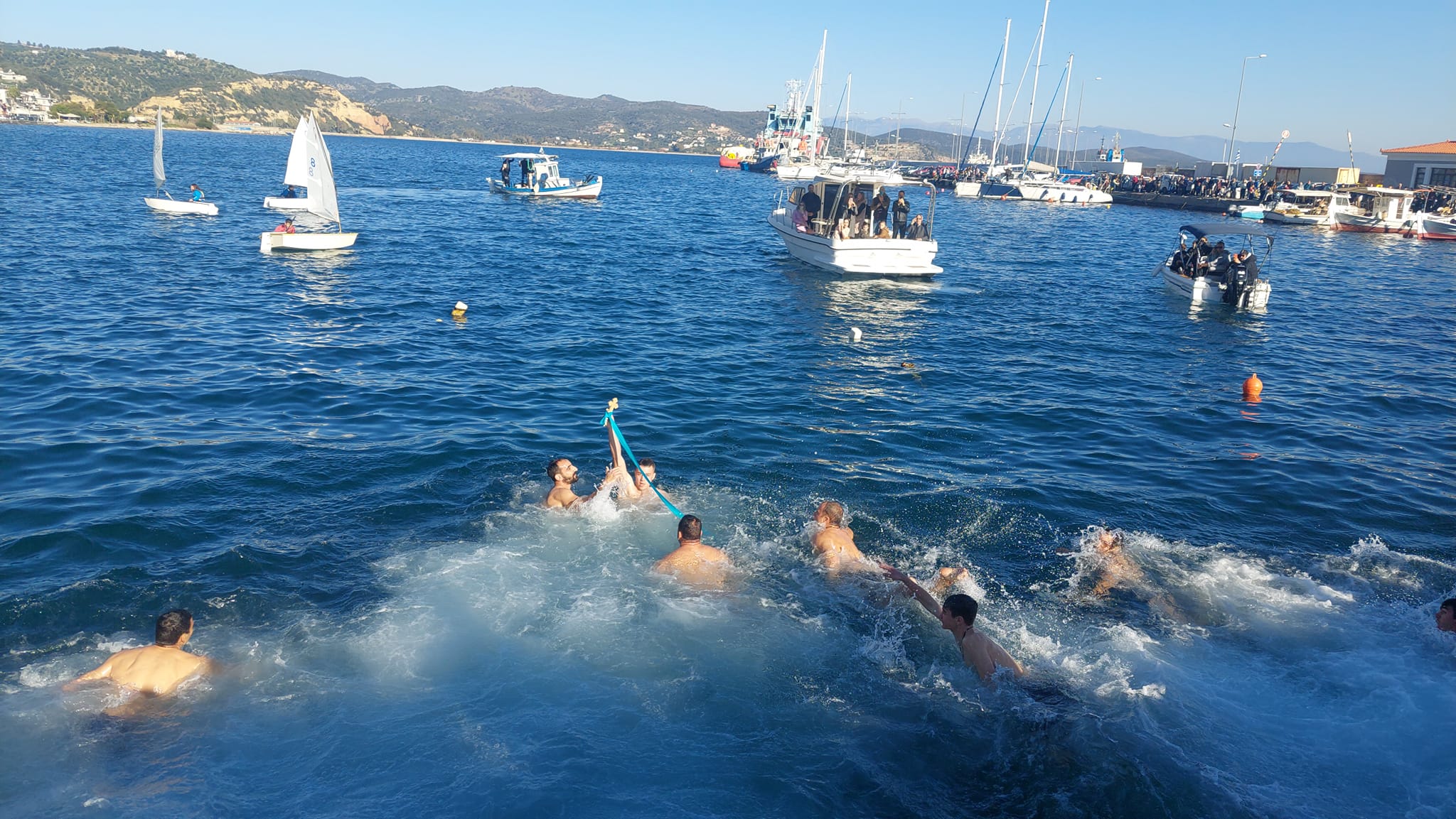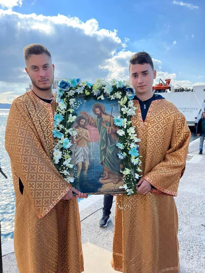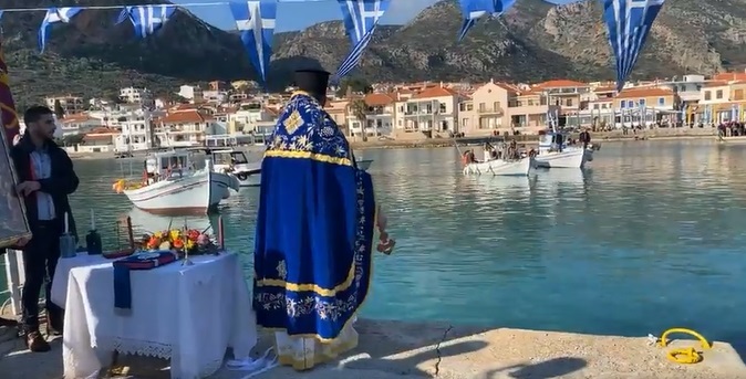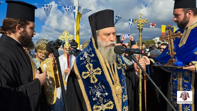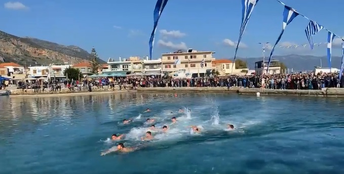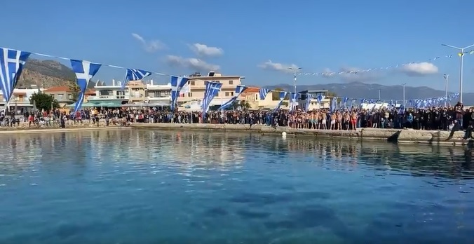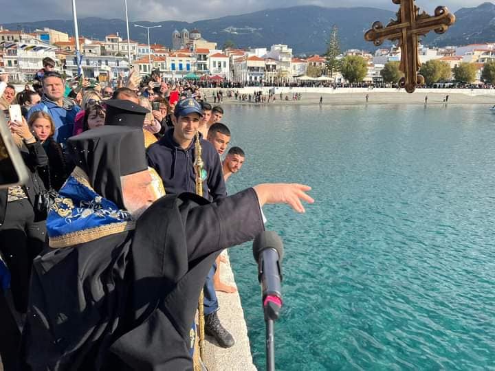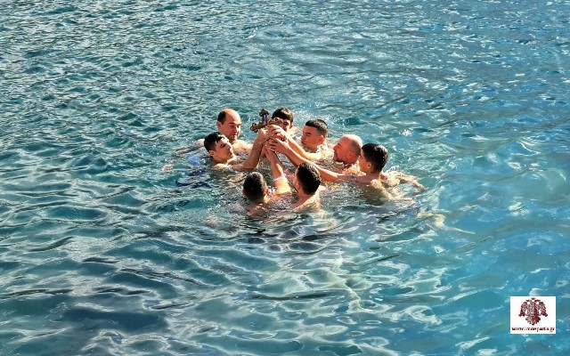 Ακολούθως, τελέσθηκε σε χαρμόσυνο κλίμα και υπό ανοιξιάτικες καιρικές συνθήκες, ο αγιασμός των υδάτων στο λιμάνι της κωμόπολης. Αρκετοί ήταν οι νέοι της περιοχής, που βούτηξαν για να πιάσουν τον Σταυρό και να δεχθούν την ευλογία Του.
