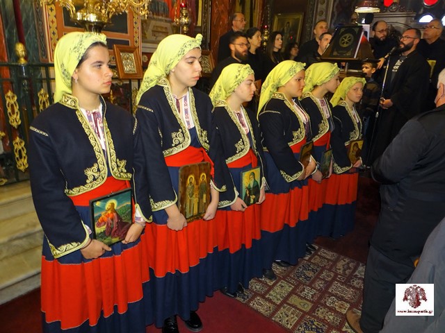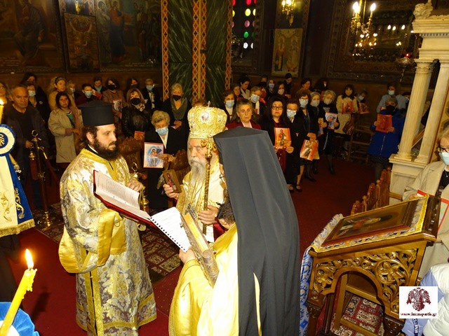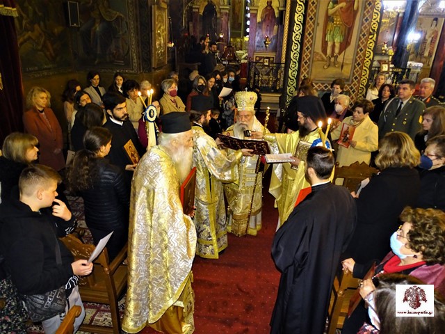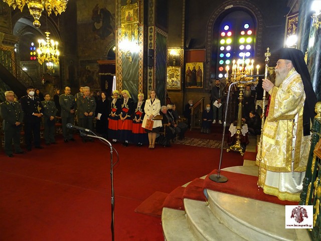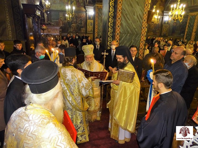 Πριν την ολοκλήρωση της λατρευτικής σύναξης, τελέστηκε, σε συγκινησιακό κλίμα, επιμνημόσυνη δέηση για τα θύματα της ανείπωτης τραγωδίας στα Τέμπη.
