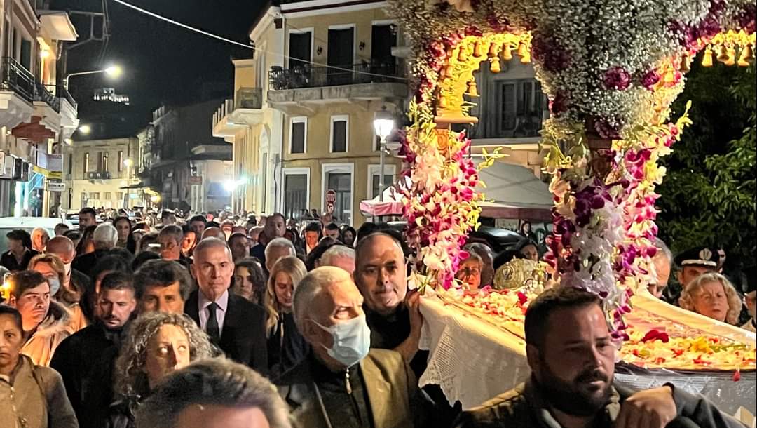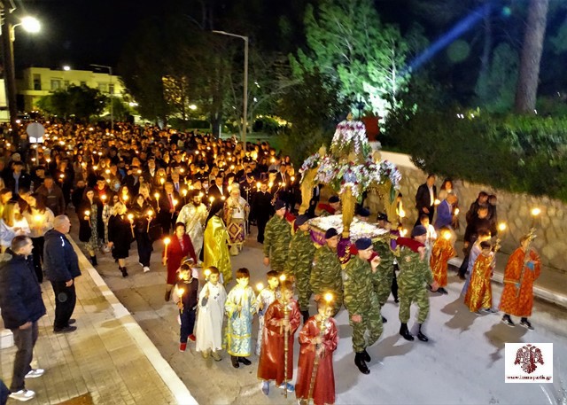 Στη συνέχεια, σε κατανυκτικό κλίμα, ξεκίνησε η περιφορά του Επιταφίου σε κεντρικούς δρόμους της Σπάρτης, προπορευομένης της Φιλαρμονικής του Δ. Σπάρτης, ενώ όπως κάθε χρόνο συνόδευε τιμητικό άγημα του Στρατού.