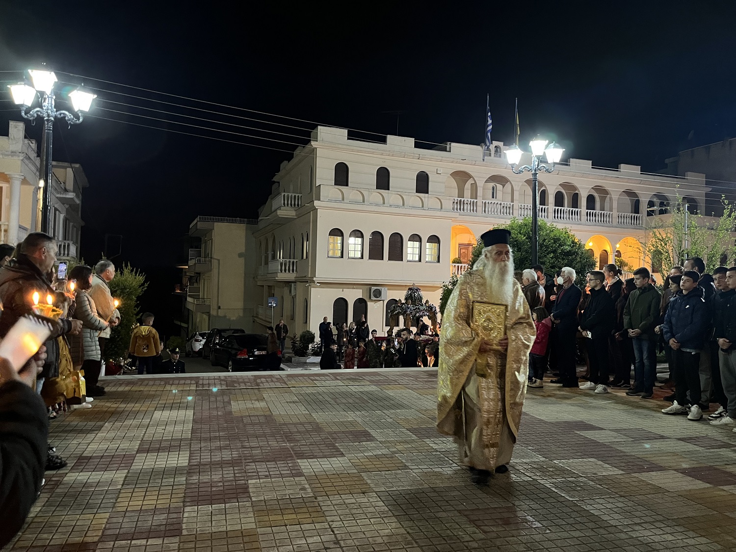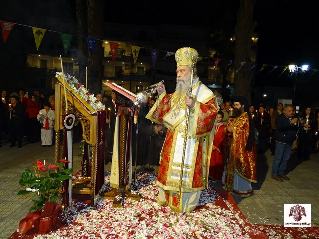 Ακολούθησε λιτάνευση, γύρωθεν του ναού, των ιερών λαβάρων και της εικόνας της Αναστάσεως. Η θρησκευτική τελετή επισφραγίστηκε με τη διανομή των πασχαλινών αυγών από τον σεβασμιώτατο, καθώς και με την ανταλλαγή εγκάρδιων ευχών.