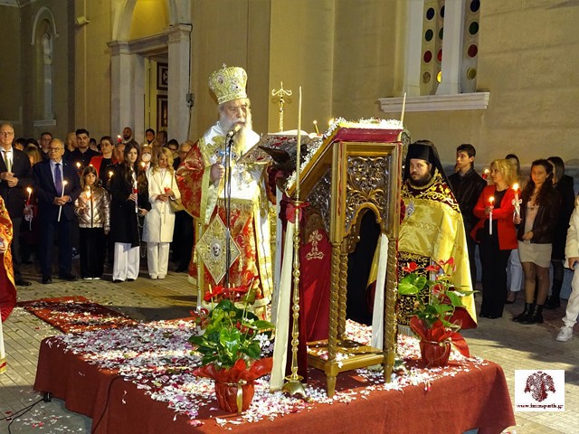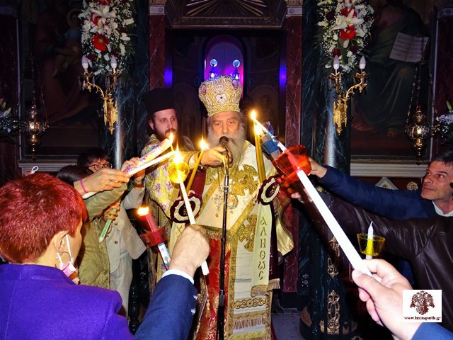 Στον πατρικό του λόγο, ο σεβασμιώτατος Μητροπολίτης ευχήθηκε «η λαμπροφόρος Ανάσταση του Κυρίου να φωτίσει τις ψυχές όλων των χριστιανών και να αποτελέσει εφαλτήριο για μία εποχή αρετής και υψηλής πνευματικότητας.» Ακολούθησε, σε χαρμόσυνο κλίμα εντός του ιερού ναού, η Αναστάσιμη αρχιερατική Θεία Λειτουργία.