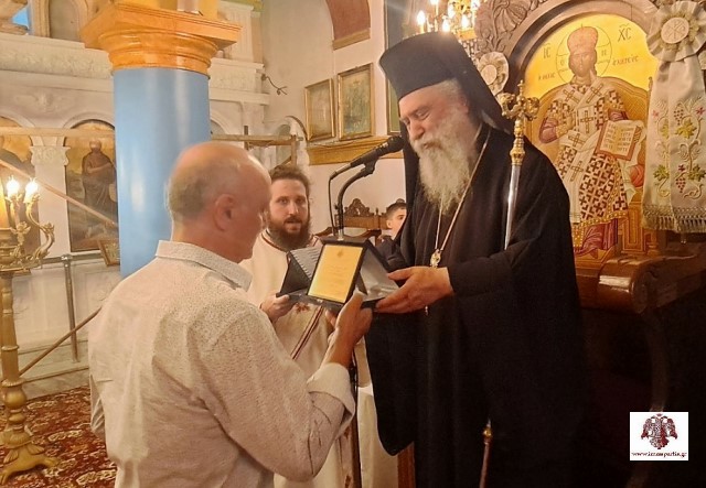 Μετά το πέρας της ακολουθίας πραγματοποιήθηκε απονομή τιμητικών πλακετών σε όλους όσοι συνέδραμαν στο έργο της επικεράμωσης του ΙΝ Αγίου Ανδρέα στις Καρυές, καθώς και στην επικείμενη διαμόρφωση του περιβάλλοντος χώρου, όπου ήδη έχουν ξεκινήσει οι πρόδρομες εργασίες.