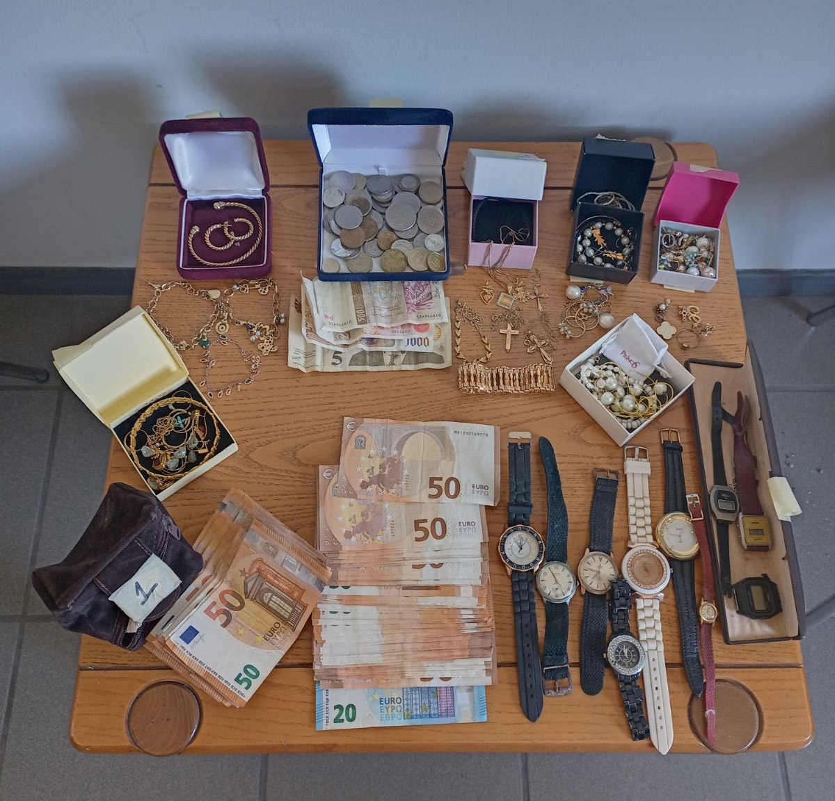 Σε συνεργασία με το Τμήμα Ασφάλειας Κορίνθου πραγματοποιήθηκαν έρευνες σε οικία, στο όχημα, αλλά και στον συλληφθέντα, όπου βρέθηκαν και κατασχέθηκαν: πλήθος κοσμημάτων και ρολογιών χειρός, συλλογή νομισμάτων και χαρτονομισμάτων από διάφορες χώρες, κινητό τηλέφωνο, καπέλο τύπου «jockey», 2 ζεύγη γυαλιών, το χρηματικό ποσό των 4.535 ευρώ, προερχόμενο από την τέλεση αξιόποινων πράξεων. Επιπλέον, κατασχέθηκε ένα όχημα, ως μέσο τέλεσης αξιόποινων πράξεων.