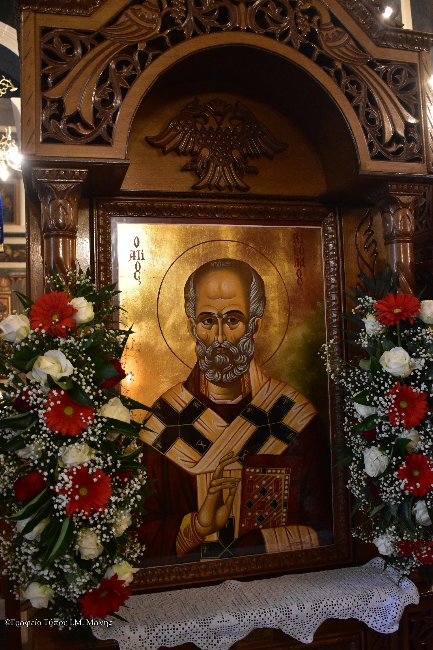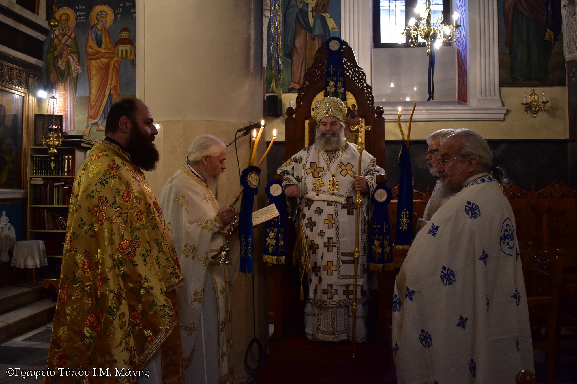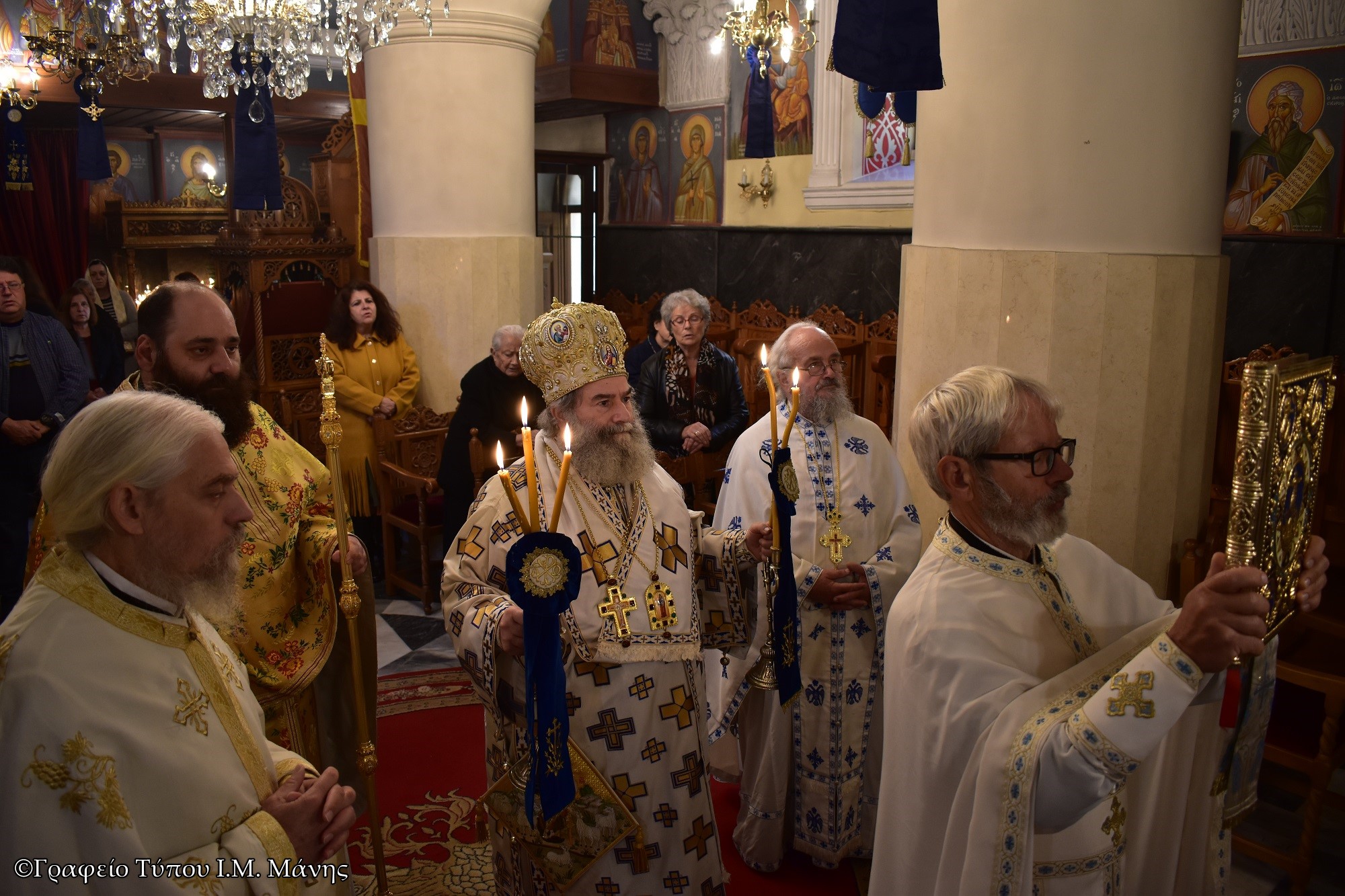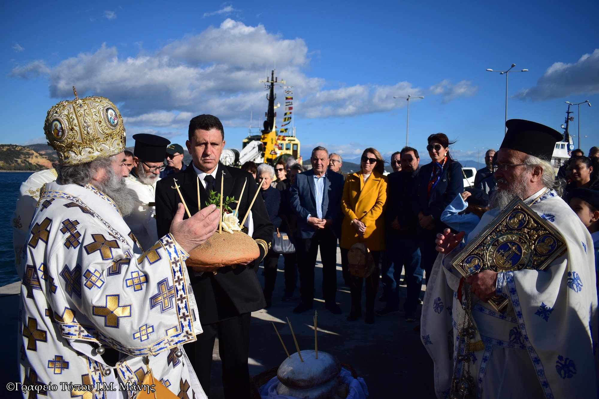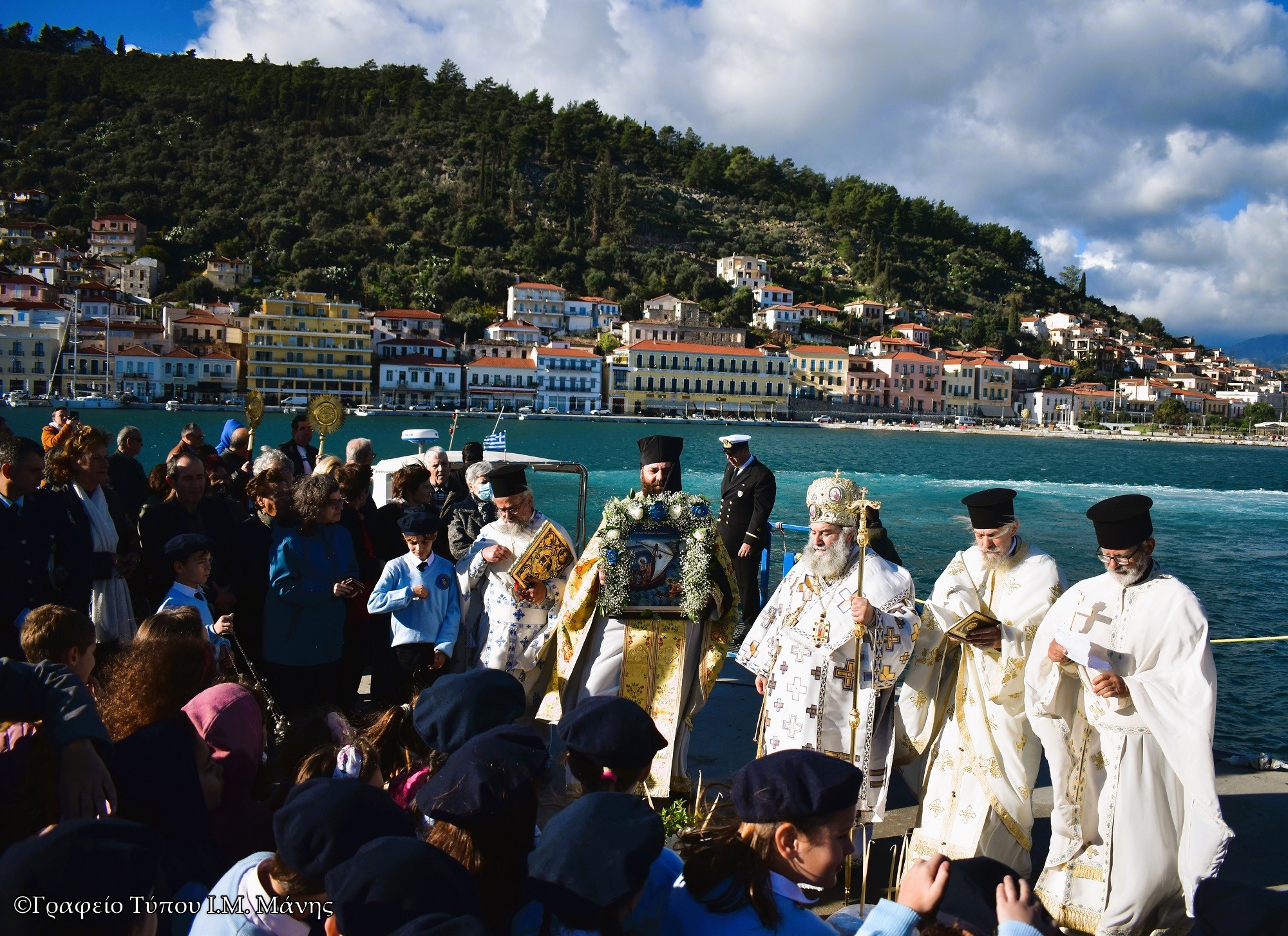 Ο σεβασμιώτατος τέλεσε τη Θεία Λειτουργία και μίλησε για την ζωή του Αγίου ερμηνεύοντας το Απολυτίκιο. Στη συνέχεια, με σκάφος και συνοδεία λιμενικών λιτάνευσε την ιερή εικόνα στο λιμάνι της πόλεως, ενώ στην προβλήτα τελέστηκε η αρτοκλασία και πλήθος κόσμου έλαβε την ευλογία του Αγίου.