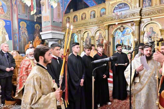 Αφού ευλογήθηκαν οι άρτοι και εψάλησαν τα εγκώμια του Αγίου ενώπιον του αποτμήματος των ιερών λειψάνων του, ο σεπτός Ποιμενάρχης χειροθέτησε εκκλησιαστικούς τέσσερις ευλαβείς νέους της ενορίας. Πρόκειται για τους μαθητές της Α΄ Λυκείου, Παναγιώτη Δημάκο του Ιωάννη, Ευάγγελο Πετράκο του Δημητρίου και Δημοσθένη Ρενέση του Παναγιώτη, καθώς και τον μαθητή της Γ΄ Γυμνασίου, Ευάγγελο Στακιά του Σταματίου.