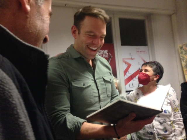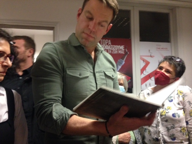 Η Παναγ. Παπαγιαννοπούλου, χάρισε στον Κασσελάκη την ατζέντα της «Ένωσης Φοροτεχνικών Λογιστών Λακωνίας». Η Βασιλ. Σαμπατάκου ένα αντίτυπο του λευκώματος «Το ταξίδι της Ευρώπης στον κόσμο» ενώ οι νεολαίοι του πρόσφεραν μια αφίσα.