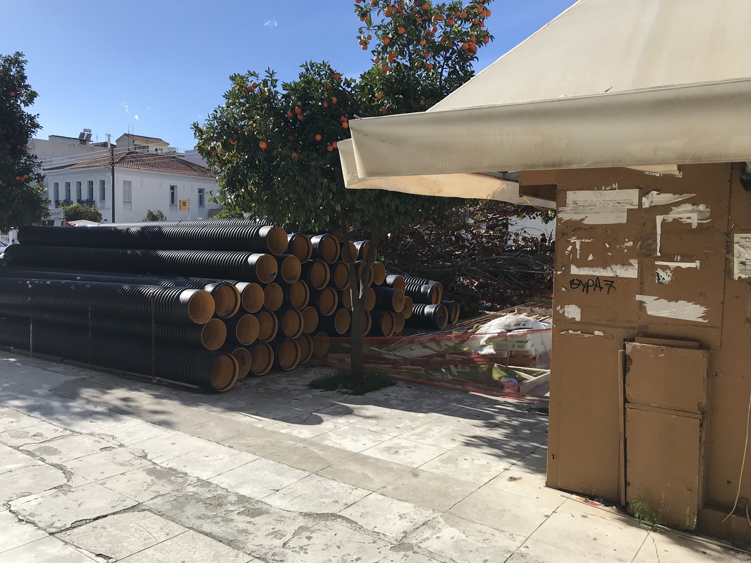 «Σας παρακαλούμε να εξετάσετε την νομιμότητα της τοποθέτησης των μεγάλων σωλήνων, που ο εργολάβος του έργου “Ανάπλαση Κ. Παλαιολόγου” έχει αφήσει εδώ και πάρα πολλούς μήνες στο πεζοδρόμιο και στη λωρίδα ανόδου της Κ. Παλαιολόγου περίπου στο ύψος της διασταύρωσης με την οδό Ευαγγελιστρίας.