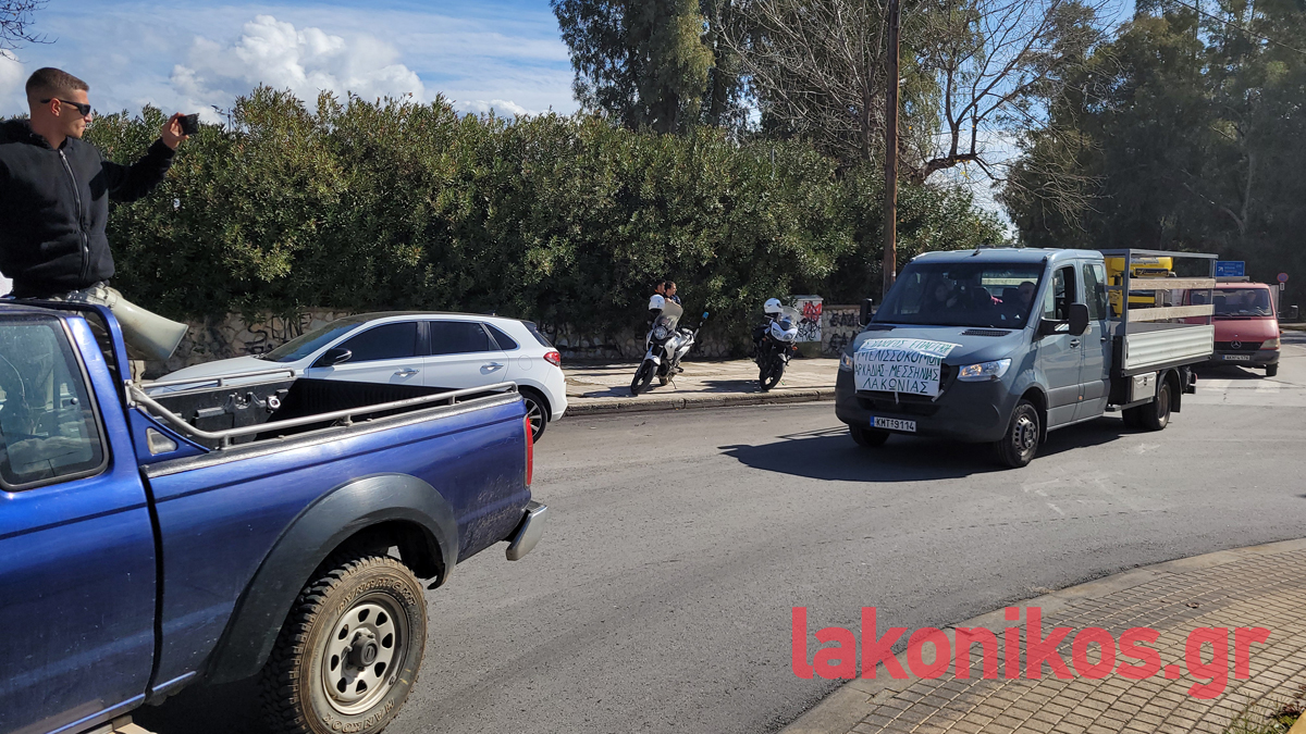 Στη συνέχεια, με αγροτικά, φορτηγά και τρακτέρ που αφίχθησαν από το μπλόκο στην ΕΟ Σπάρτης-Γυθείου, πραγματοποίησαν ειρηνική μηχανοκίνητη πορεία με κορναρίσματα, διασχίζοντας τη Λυκούργου και στη συνέχεια μέσω της περιμετρικής οδού και της Γυθείου κατευθύνθηκαν στο Διοικητήριο Λακωνίας. Εκεί, οι εκπρόσωποι αγροτοκτηνοτρόφων-μελισσοκόμων κατέθεσαν τις αξιώσεις τους στον διευθυντή της Δ/νσης Αγροτικής Οικονομίας & Κτηνιατρικής ΠΕ Λακωνίας, ενώ ακολούθως, ως ένδειξη διαμαρτυρίας, σκόρπισαν σανό και έχυσαν γάλα στην είσοδο του Διοικητηρίου.