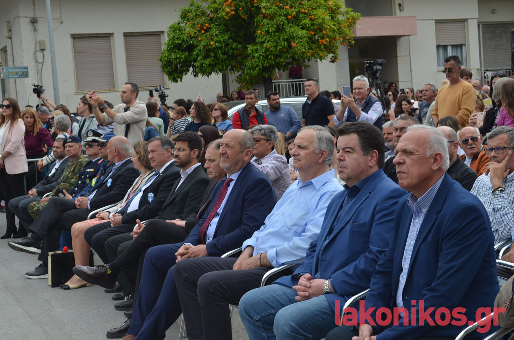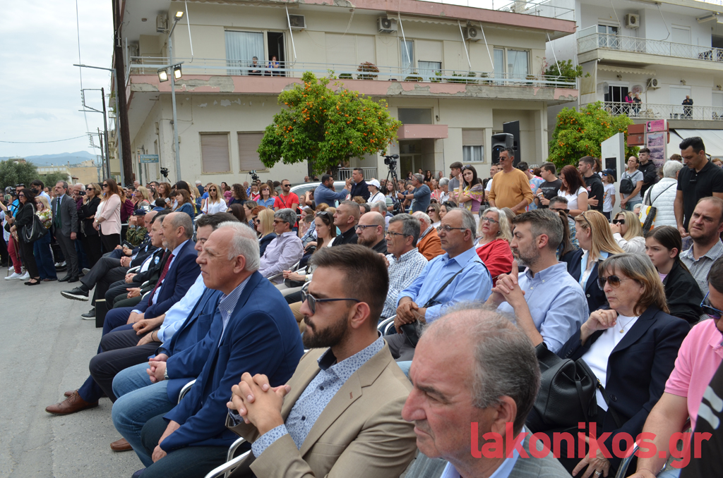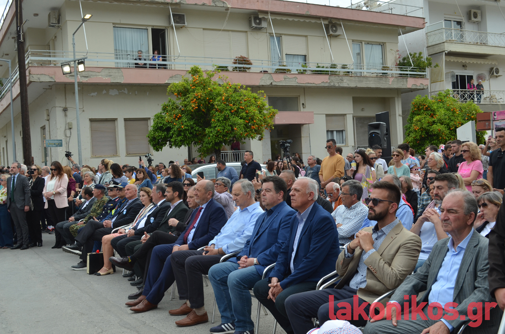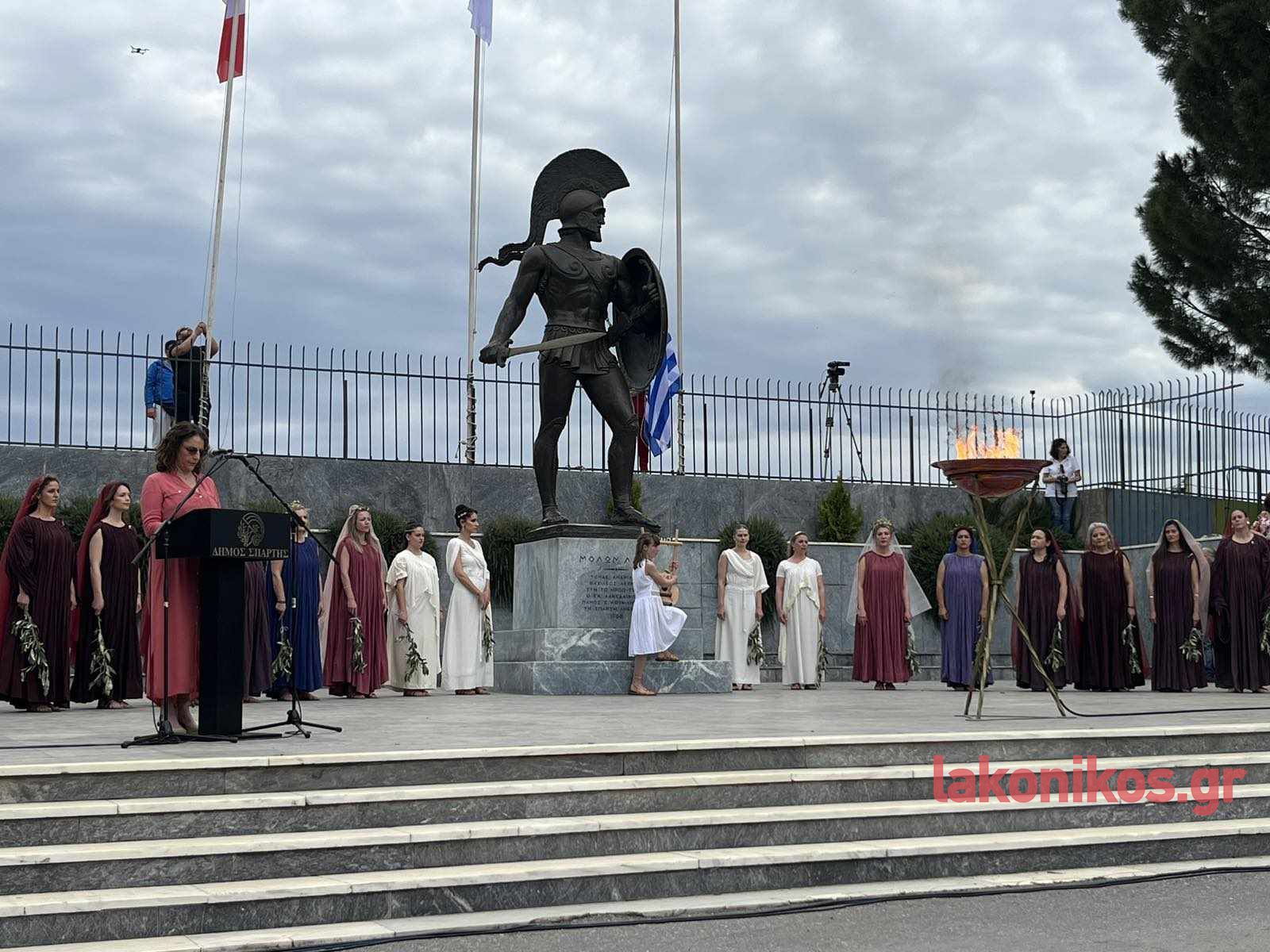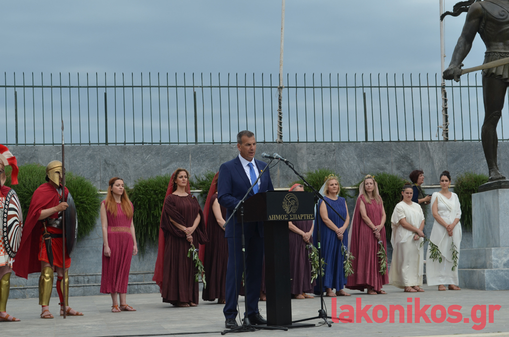 Ο δήμαρχος Σπάρτης, Μιχάλης Βακαλόπουλος, στον χαιρετισμό του καλωσόρισε τους υψηλούς προσκεκλημένους, κάνοντας λόγο για «τη Σπάρτη, την προστάτιδα του Ολυμπισμού και του Ολυμπιακού Ιδεώδους. Πριν από 2.800 χρόνια, ο μεγαλύτερος νομοθέτης του αρχαίου κόσμου, ο Λυκούργος, μαζί με τους βασιλείς της Ήλιδας, Οινόμαο, και Πίσας, Κλεοσθένη, χάραξαν στον δίσκο το ιερό κείμενο της Εκεχειρίας, καθιερώνοντας έτσι το μακροβιότερο σύμβολο Ειρήνης στον αρχαίο κόσμο». Παρατήρησε πως «η έλευση της Φλόγας στη Σπάρτη αποτελεί έμπρακτη αναγνώριση του ιστορικού και πολιτισμικού ρόλου της πόλης μας». «Ένα από τα σημαντικότερα σύμβολα του Ολυμπιακού Κινήματος, με οικουμενική απήχηση, η Φλόγα, βρίσκεται σήμερα εδώ», είπε και συνέχισε: «Και από αυτό το σημείο, το άγαλμα του Λεωνίδα, στέλνουμε σε όλο τον κόσμο το μήνυμα της Ειρήνης. Ειδικά σε μια περίοδο που μαίνονται στον γεωπολιτικό μας χώρο και γειτονιά, συγκρούσεις, οι οποίες μάς ανησυχούν όλους. Στόχος μας είναι να μπολιάσουμε τους νέους με το δέντρο της ειρήνης και της ελπίδας. Να μεταδώσουμε τη δύναμη των αξιών του τόπου μας σε κάθε γωνιά του πλανήτη. Το Ολυμπιακό Ιδεώδες, την πίστη στην αξία του Ανθρώπου, τον σεβασμό στον αντίπαλο, το Ευ Αγωνίζεσθαι, τη συναδέλφωση των λαών και τη διεθνή Ειρήνη». Πλέκοντας το εγκώμιο όλων των συντελεστών, μεταξύ άλλων, επεσήμανε ότι «είμαστε σίγουροι ότι οι φετινοί Ολυμπιακοί Αγώνες στο Παρίσι θα στεφθούν με επιτυχία».