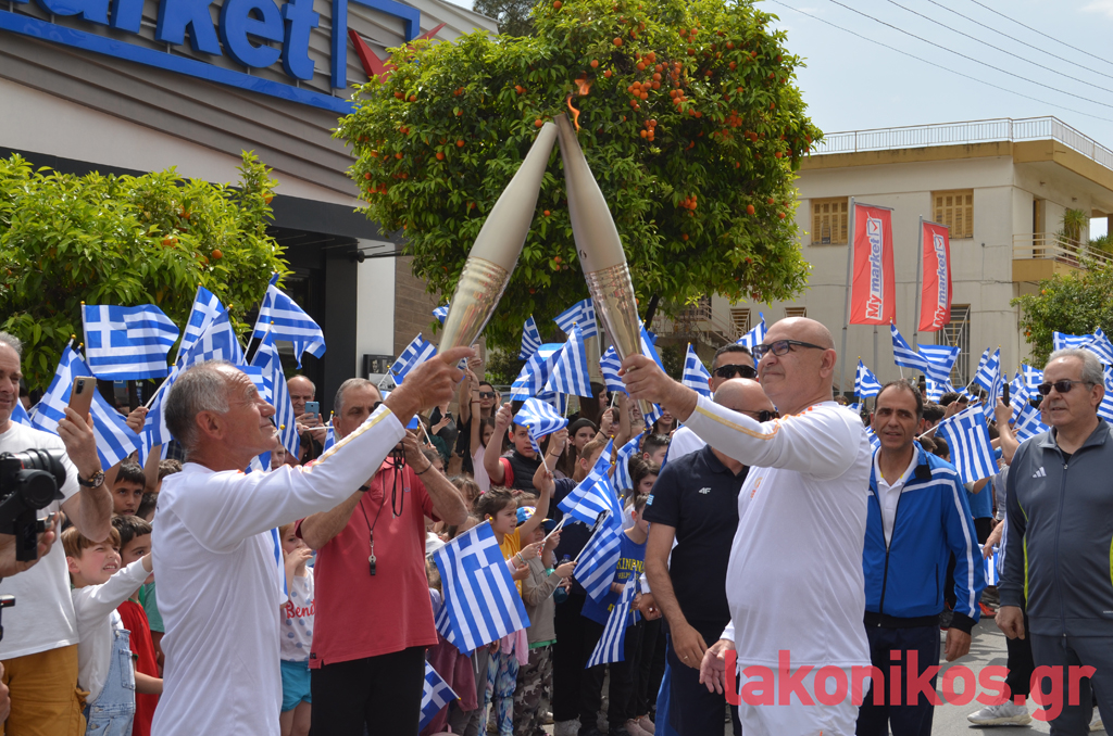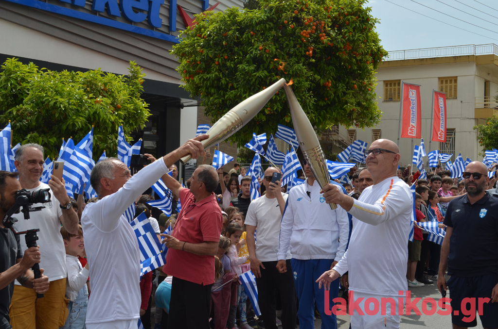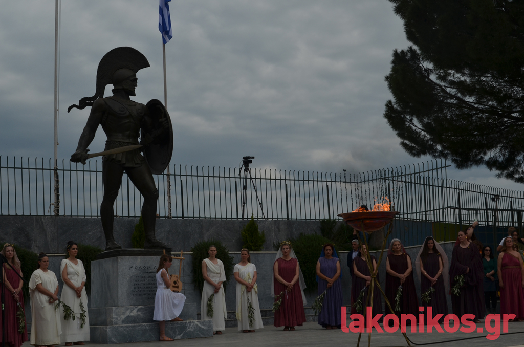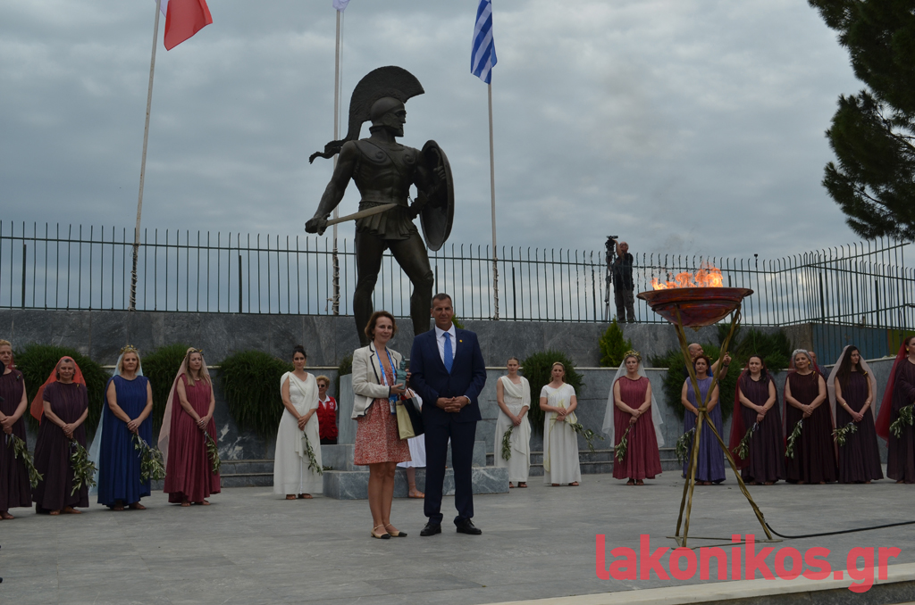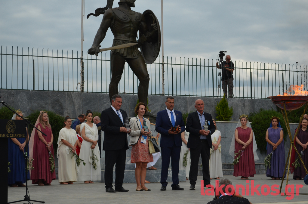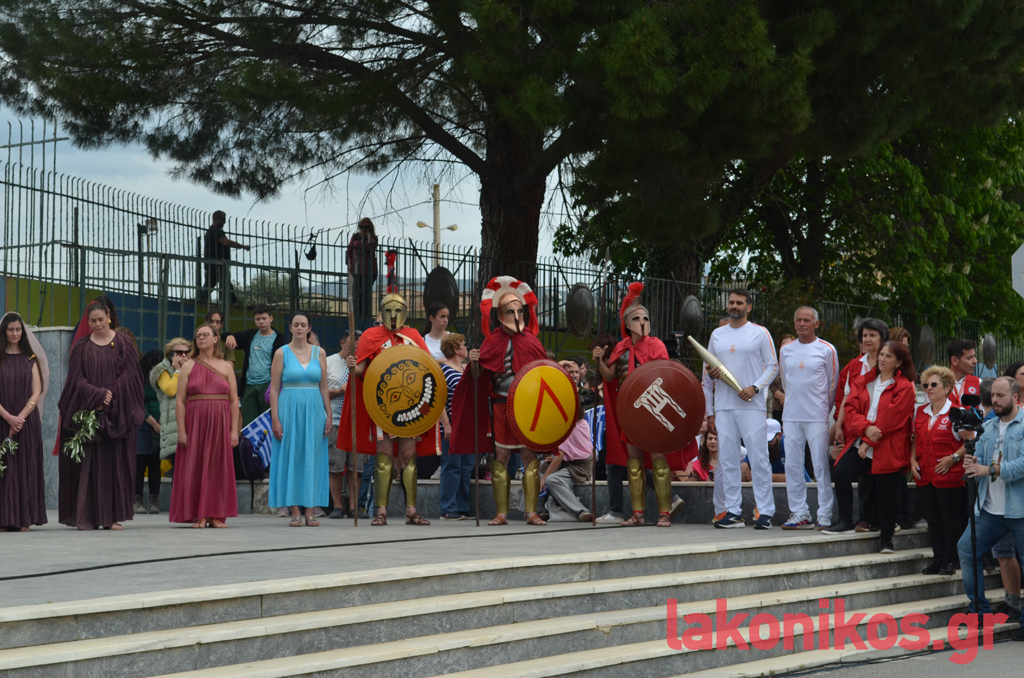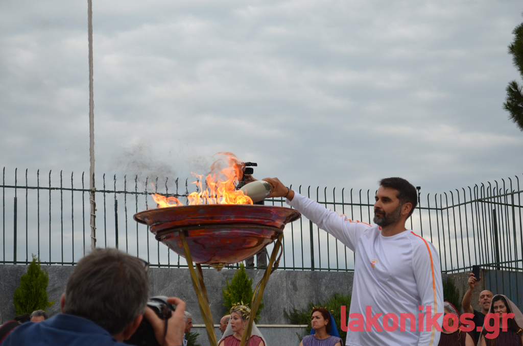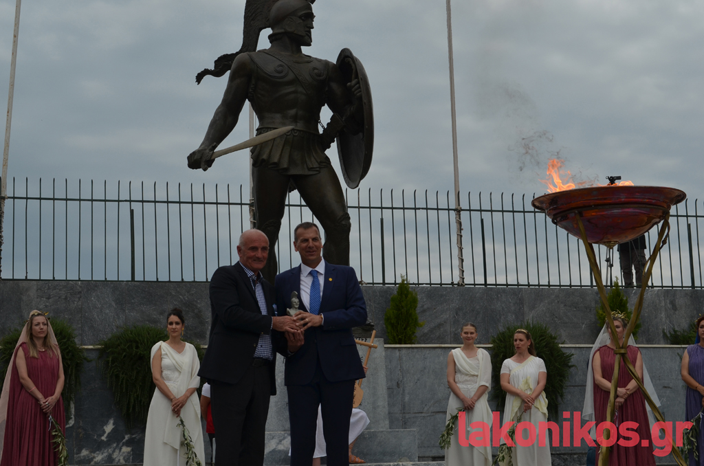 Ο θρύλος του Σπάρταθλον, Γιάννης Κούρος, έλαβε τη Φλόγα από τον Αθ. Στρίγκα, στη συμβολή των Κ. Παλαιολόγου - Οθ. Αμαλίας και με σταθερό ρυθμό βάδισε στην κεντρική λεωφόρο ως το ύψος της Βρασίδου. Εκεί ανέμενε ο Γιώργος Κουλόγιαννης, ο οποίος πήρε τη σκυτάλη του Φωτός και διανύοντας τα τελευταία μέτρα της πορείας, ήταν εκείνος που άναψε τον βωμό που είχε στηθεί μπροστά από το Δημοτικό Στάδιο Σπάρτης. Υπό το άγρυπνο βλέμμα του βασιλιά Λεωνίδα και υπό το ζεστό χειροκρότημα των εκπροσώπων αρχών-φορέων και των απλών πολιτών που είχαν συρρεύσει στο σημείο, η ατμόσφαιρα ήταν γιορτινή και κατανυκτική.