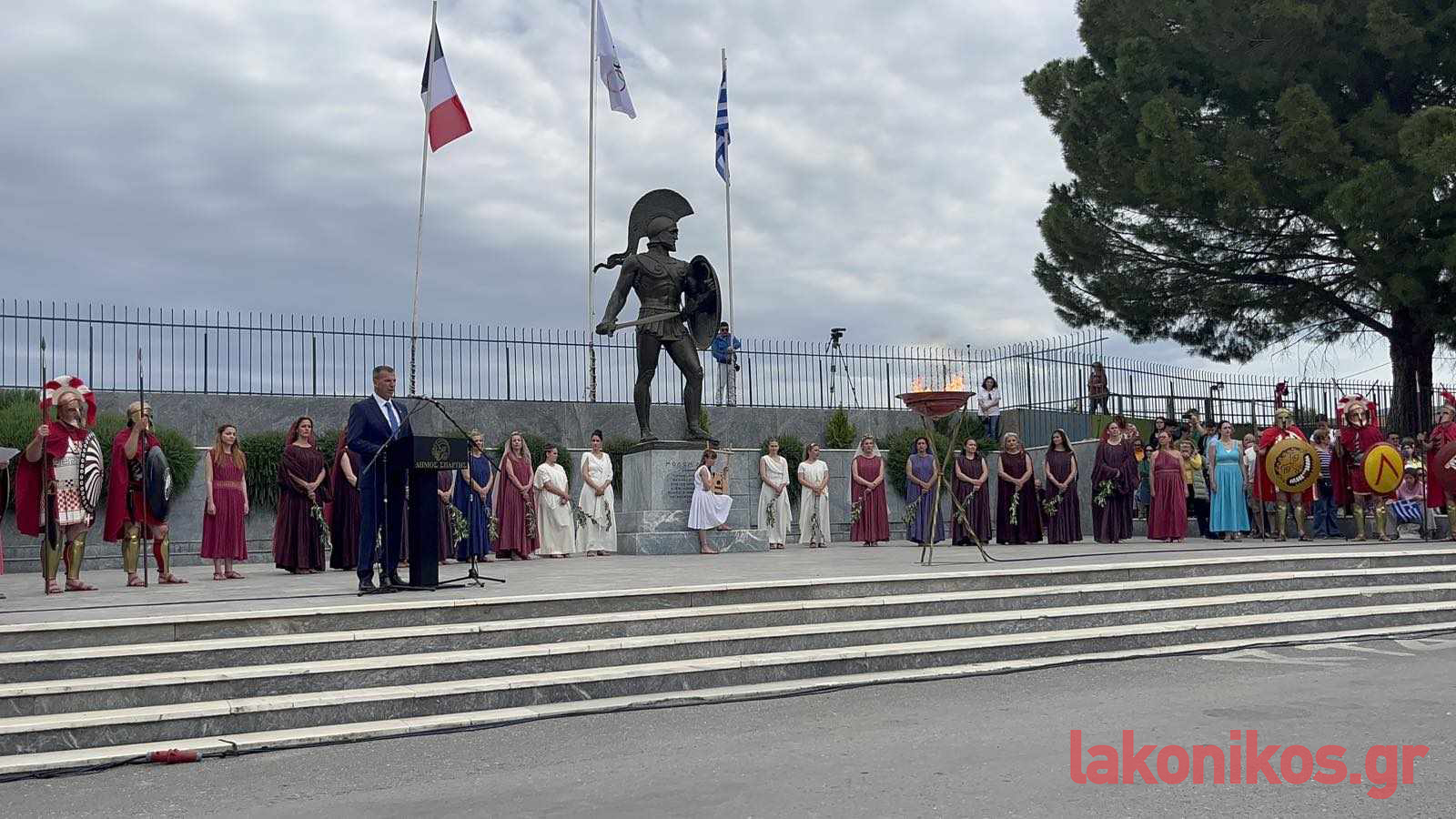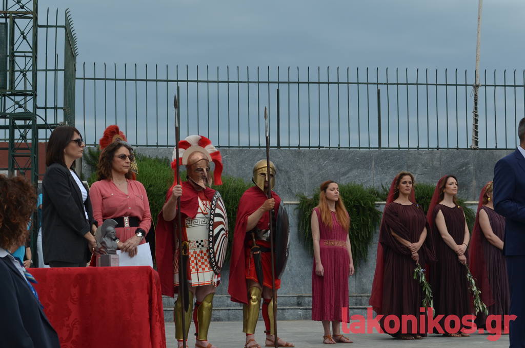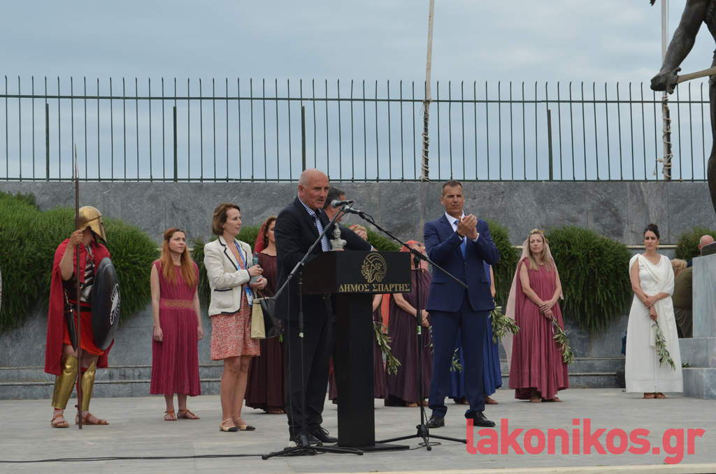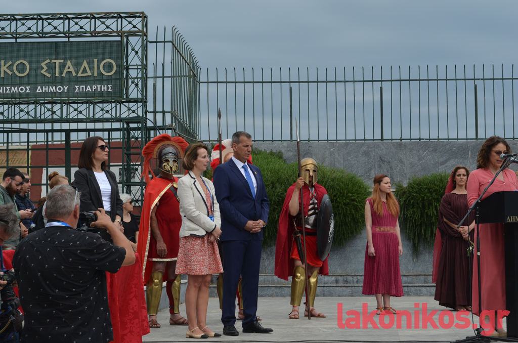 Ακολούθησε μια δωρική και απέριττη τελετή που είχε ετοιμάσει ο Δήμος Σπάρτης, η οποία ξεκίνησε με ανάκρουση του Ολυμπιακού Ύμνου, του Εθνικού Ύμνου της Γαλλίας και του Εθνικού Ύμνου της Ελλάδας, με ταυτόχρονη έπαρση των τριών σημαιών.