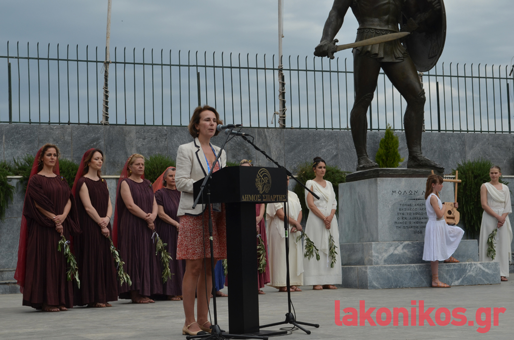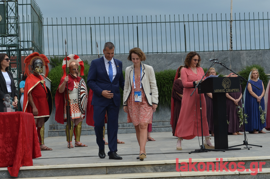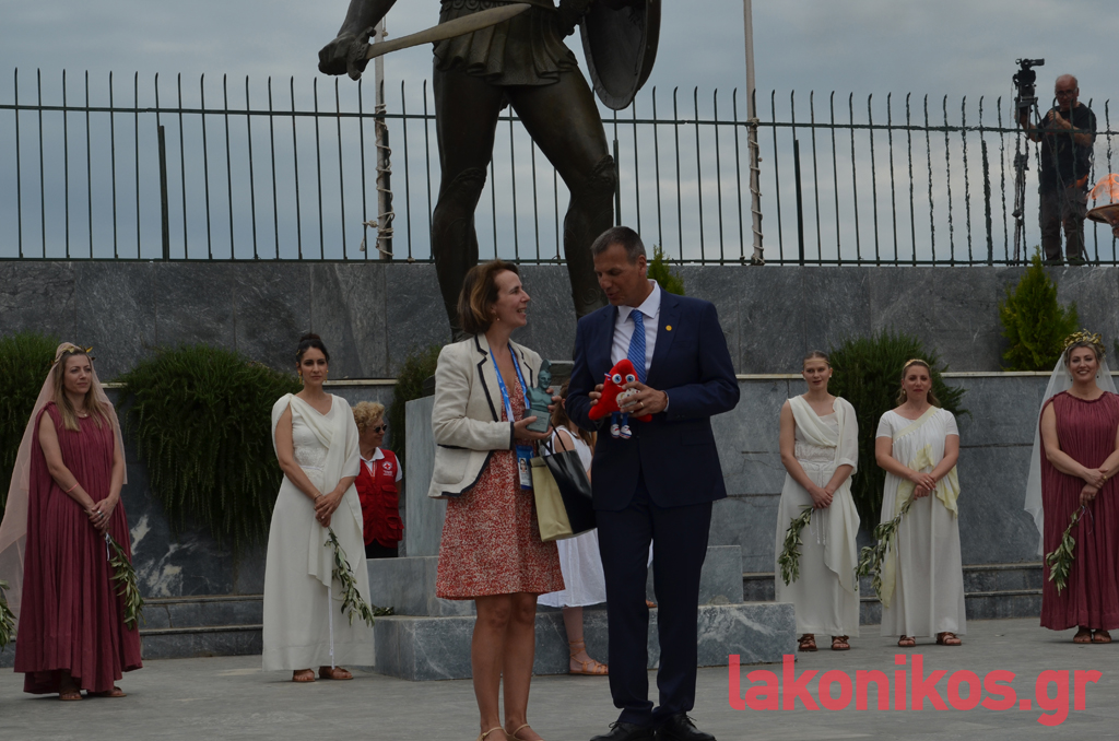 Έπειτα, πραγματοποιήθηκε χαιρετισμός από εκπρόσωπο της Οργανωτικής Επιτροπής των Ολυμπιακών Αγώνων «Παρίσι 2024», η οποία μίλησε για τις αρχές και τις αξίες του Ολυμπισμού, απευθύνοντας παράλληλα την ευγνωμοσύνη της χώρας της στην Ελλάδα και τη Σπάρτη.