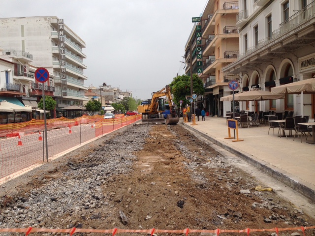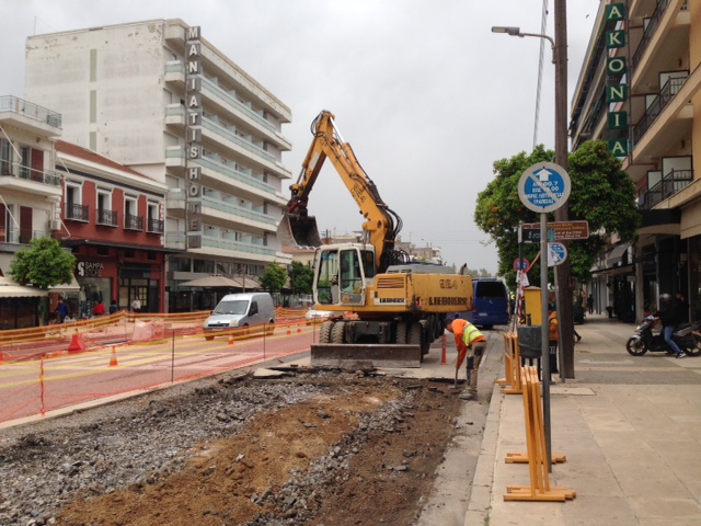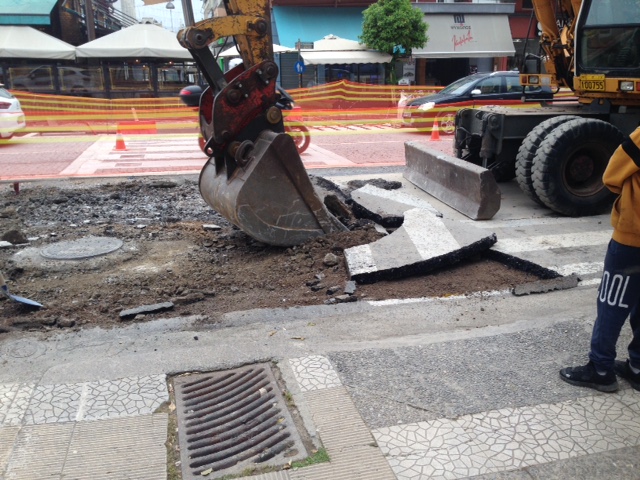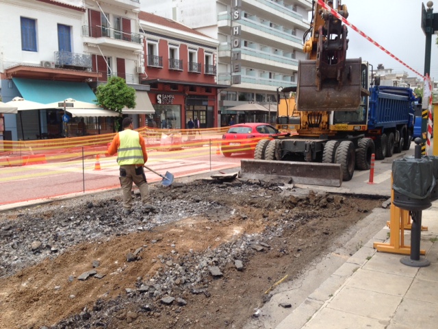 Σε αυτή την έκταση λοιπόν εκτελούνται οι εργασίες αποξήλωσης της ασφάλτου. Οι εργασίες αυτονόητα είναι επιφανειακές και στη συνέχεια θα φτάσουν σε μεγαλύτερο βάθος. Η κυκλοφορία στο συγκεκριμένο τμήμα ανάμεσα σε Βρασίδου και Λυκούργου διεξάγεται -σε άνοδο και κάθοδο- από τις αντίστοιχες λωρίδες που έχουν ήδη στρωθεί με τους κυβόλιθους.