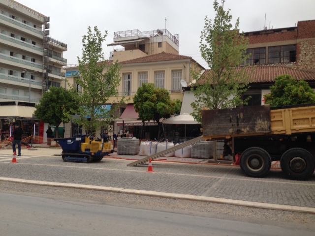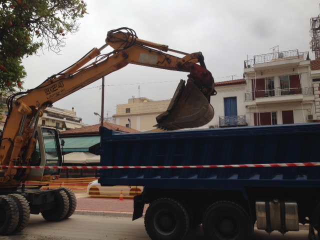 Σας έλειψαν; Τα πεθυμήσατε; Ορίστε λοιπόν, επιστρέφουν. Τα εργατικά μηχανήματα της αναδόχου ΔΟΜΗΚΑΤ, ύστερα από ένα διάλειμμα ολίγων εβδομάδων, ξανάβαλαν μπρος (23/4) και συνεχίζουν, με έναν τρόπο, το πολυτάραχο έργο της ανάπλασης της Κωνσταντίνου Παλαιολόγου, στο κέντρο της Σπάρτης. Σε διαφορετικό σημείο αυτή τη φορά.