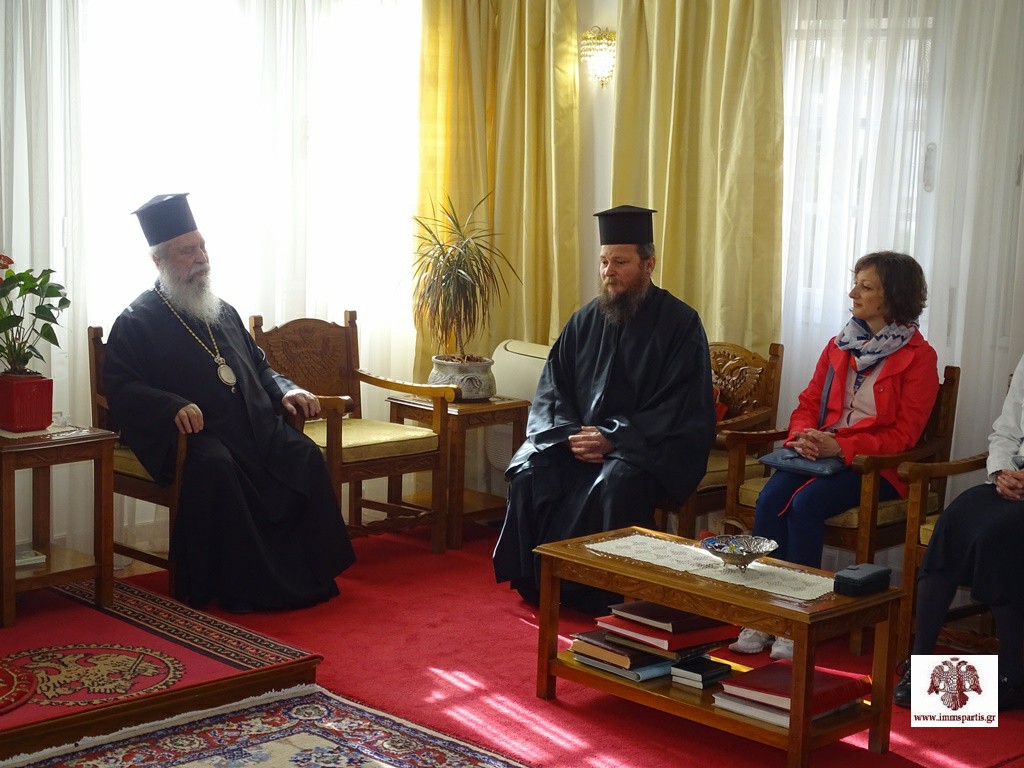 Από την πλευρά της νησιωτικής μαθητικής αποστολής, μίλησε η κ. Καρακατσάνη, η οποία εξέφρασε την ευγνωμοσύνη της για τη θερμή υποδοχή, ενώ διατράνωσε την βεβαιότητά της ότι η εκπαιδευτική αυτή εκδρομή θα αποτελέσει μοναδική εμπειρία, με πολύτιμα πνευματικά μηνύματα, τόσο για τα παιδιά όσο και για τους συνοδούς. Παράλληλα, εκ μέρους των εκδρομέων, πρόσφερε στον Σεβασμιώτατο ένα συμβολικό δώρο από το πανέμορφο νησί της Λέσβου.