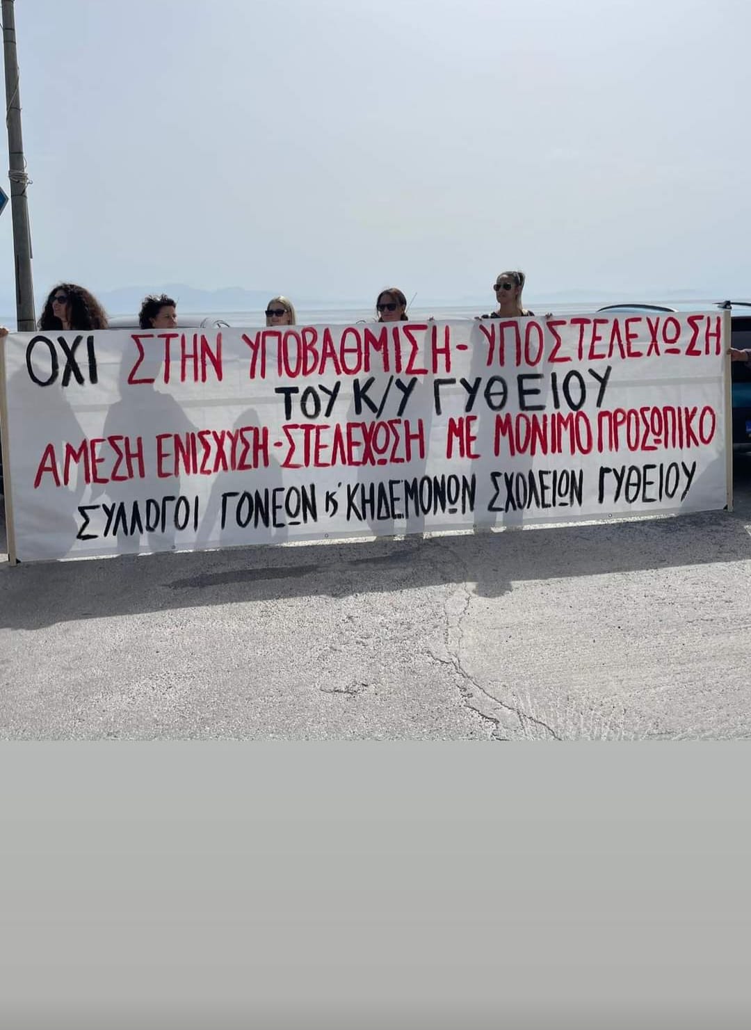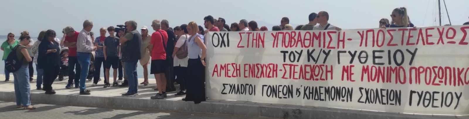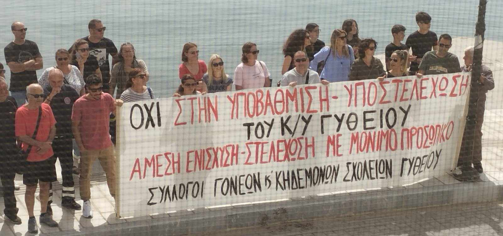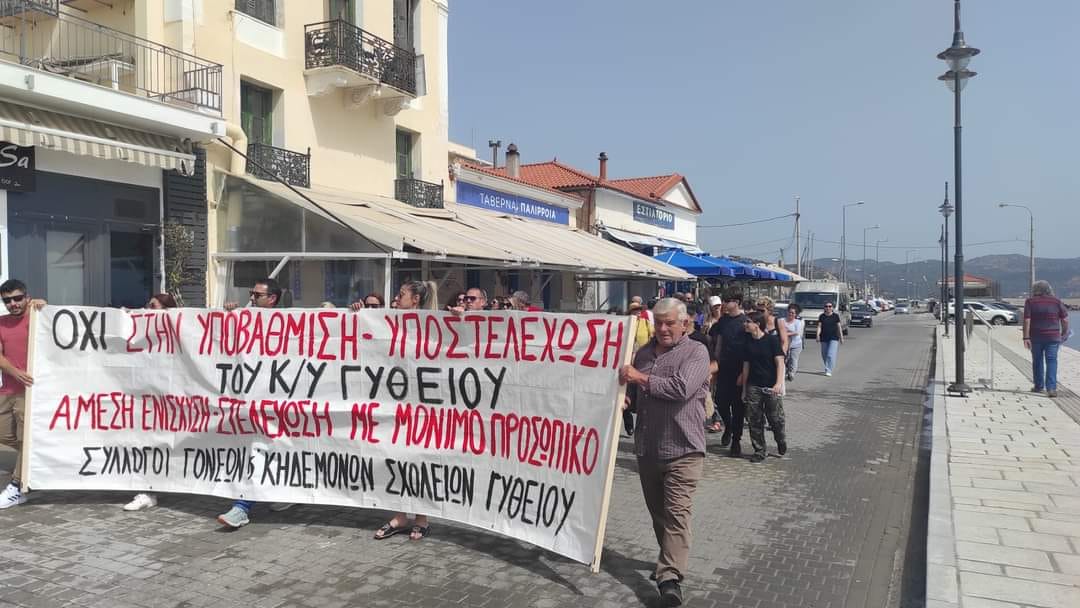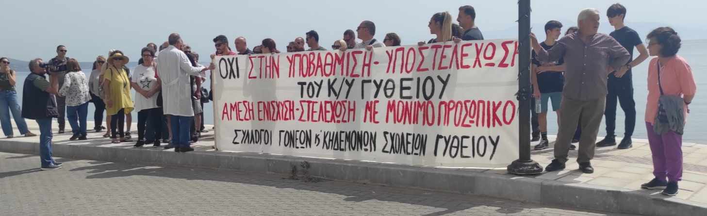Με σφιγμένα πρόσωπα, οι γονείς-μέλη των 5 συλλόγων γονέων και κηδεμόνων από τις σχολικές μονάδες του Γυθείου, πήραν μέρος σε πορεία και παράσταση διαμαρτυρίας στον χώρο του Κέντρου Υγείας Γυθείου, την Τρίτη (21/5). Οι σύλλογοι από το Γυμνάσιο Γυθείου, το Λύκειο Γυθείου, αλλά και από το 1ο, 2ο και 3ο Δημοτικό Σχολείο της πόλης, συγκεντρώθηκαν στην είσοδο του λιμανιού κι από εκεί πορεύτηκαν ως τη μονάδα υγείας, όπου παρέμειναν για μισή ώρα περίπου. Συνάντησαν και συνομίλησαν με το ιατρικό και νοσηλευτικό προσωπικό, υπογραμμίζοντας την αμέριστη στήριξή στο έργο του. Τόνισαν την ανάγκη διατήρησης σε λειτουργία του ΚΥ, αλλά και της περαιτέρω ενίσχυσής του. Από τη συζήτηση και την ανταλλαγή απόψεων που ακολούθησε, αποκόμισαν την έντονη ανησυχία γιατρών και νοσηλευτών για το τι μέλλει γενέσθαι τον μήνα Ιούνιο. Ας επαναλάβουμε πως η εξάντληση των ανθρώπινων πόρων του ΚΥ θέτει σε κίνδυνο τη λειτουργία του, ενώ η άρνηση γιατρών του να μετακινηθούν για εφημερίες στο ΓΝ Σπάρτης, δημιούργησε σκηνικό ανοιχτής σύγκρουσης.