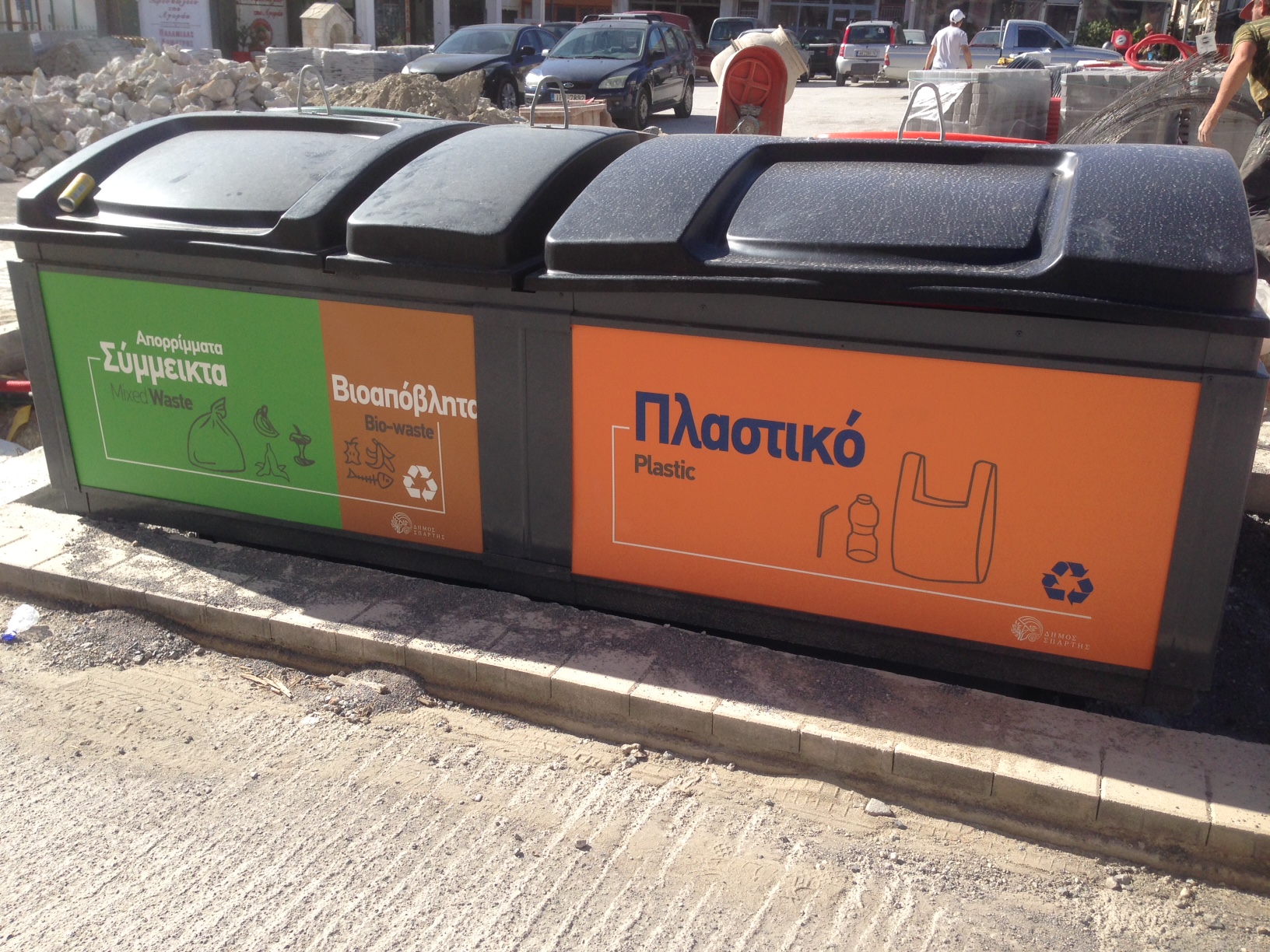Οι ημιβυθιζόμενοι κάδοι του Open Mall ακολουθούν το ισχύον από παλιά σχέδιο διαχείρισης αποβλήτων του Δήμου Σπάρτης που αφορούσε σε διαλογή στην πηγή και 6 ρεύματα αποβλήτων: Σύμμεικτα, βιοαπόβλητα, πλαστικό, μέταλλο, γυαλί και χαρτί.