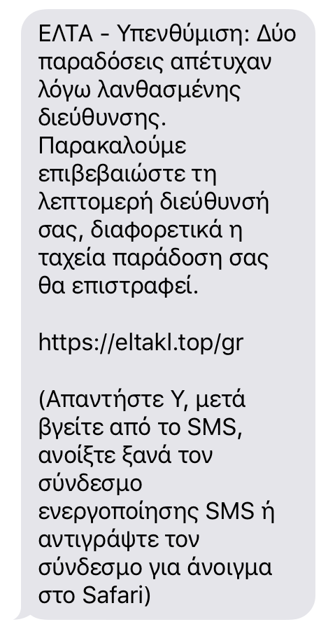 Συγκεκριμένα, στο sms αναγράφονται, με παραλλαγές τα εξής: «ΕΛΤΑ -Υπενθύμιση: Δύο παραδόσεις απέτυχαν λόγω λανθασμένης διεύθυνσης. Παρακαλούμε επιβεβαιώστε τη λεπτομερή διεύθυνσή σας, διαφορετικά η ταχεία παράδοσή σας, θα επιστραφεί».
