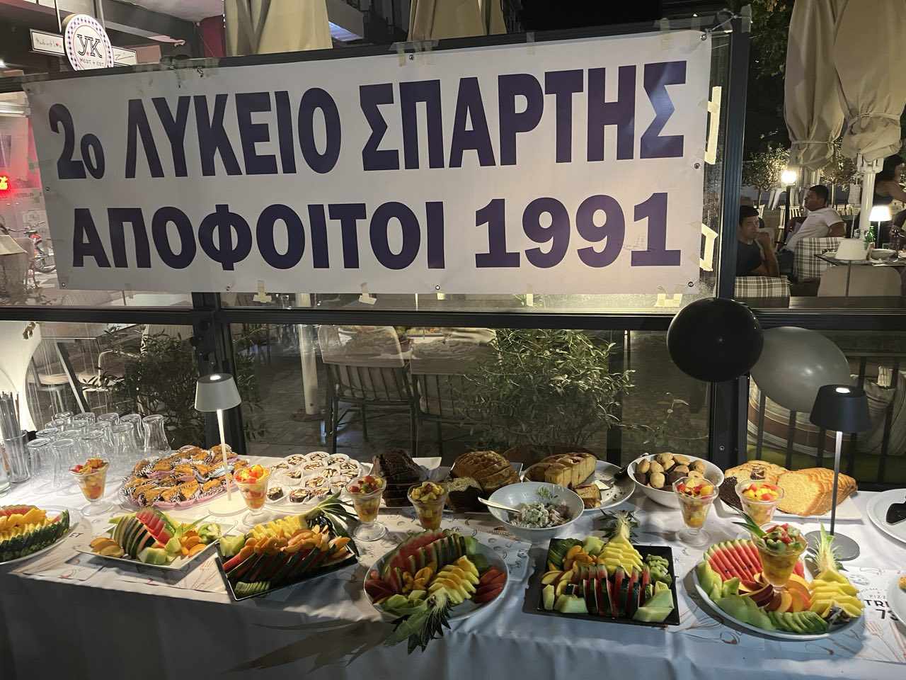 Αμέσως μετά, μετέβησαν στην κεντρική πλατεία Σπάρτης και το κατάστημα «Street 73», που διατηρεί ένα από τα μέλη της παρέας των συμμαθητών, ο Βασίλης Τσαρούχας. Εκεί, πιο χαλαροί, αντάλλαξαν νέα και εμπειρίες μέσα στο διάβα των ετών, από το μέρος που οδήγησε τον καθένα ο μαραθώνιος της ζωής. Όπως επέβαλε η περίσταση, το κλίμα ήταν εορταστικό και τα άλλοτε σχολιαρόπαιδα το έριξαν… έξω μέχρι αργά, συνοδεία πλούσιου μπουφέ με φαγητό, γλυκά, φρούτα και φυσικά ποτά.