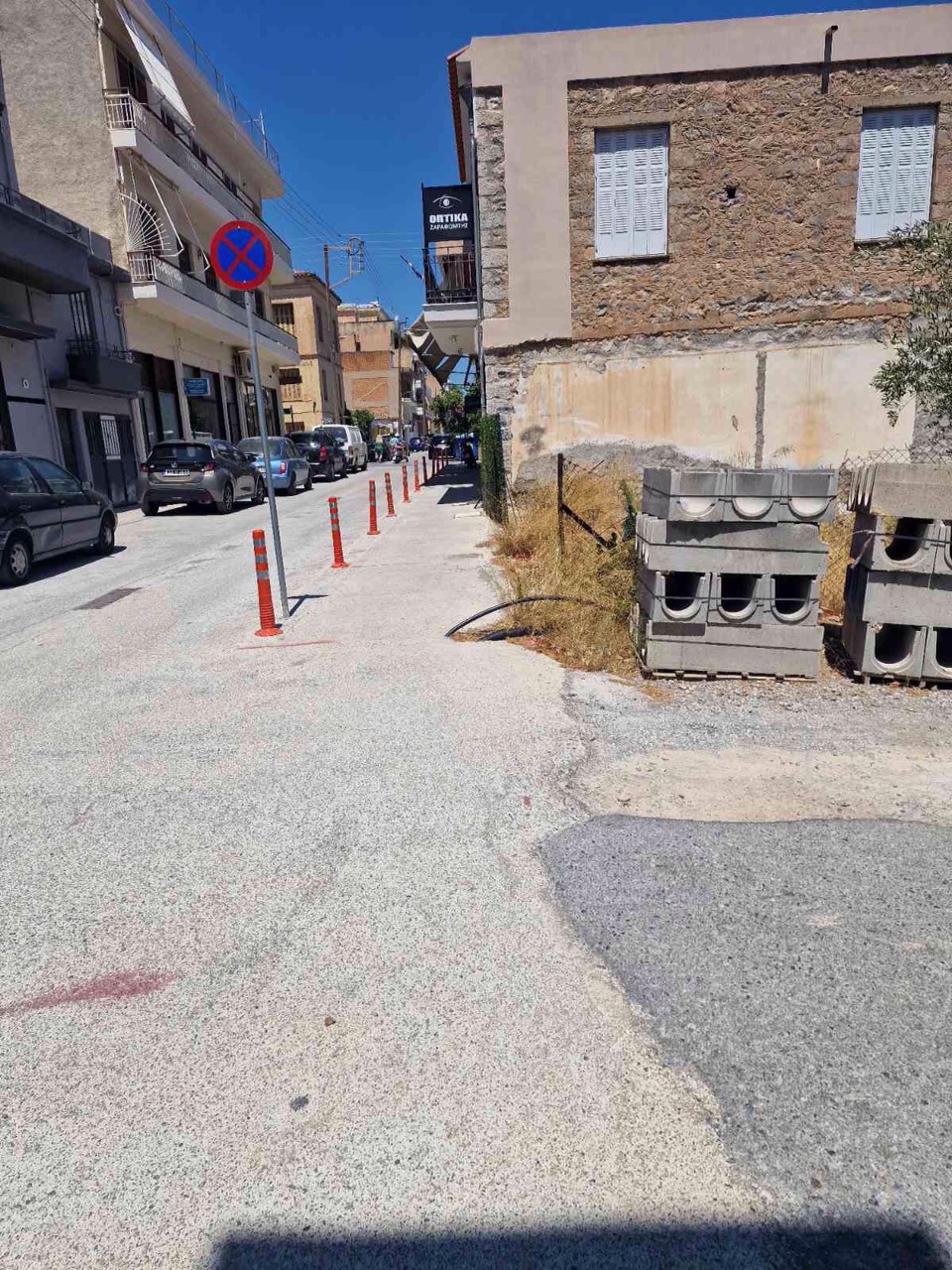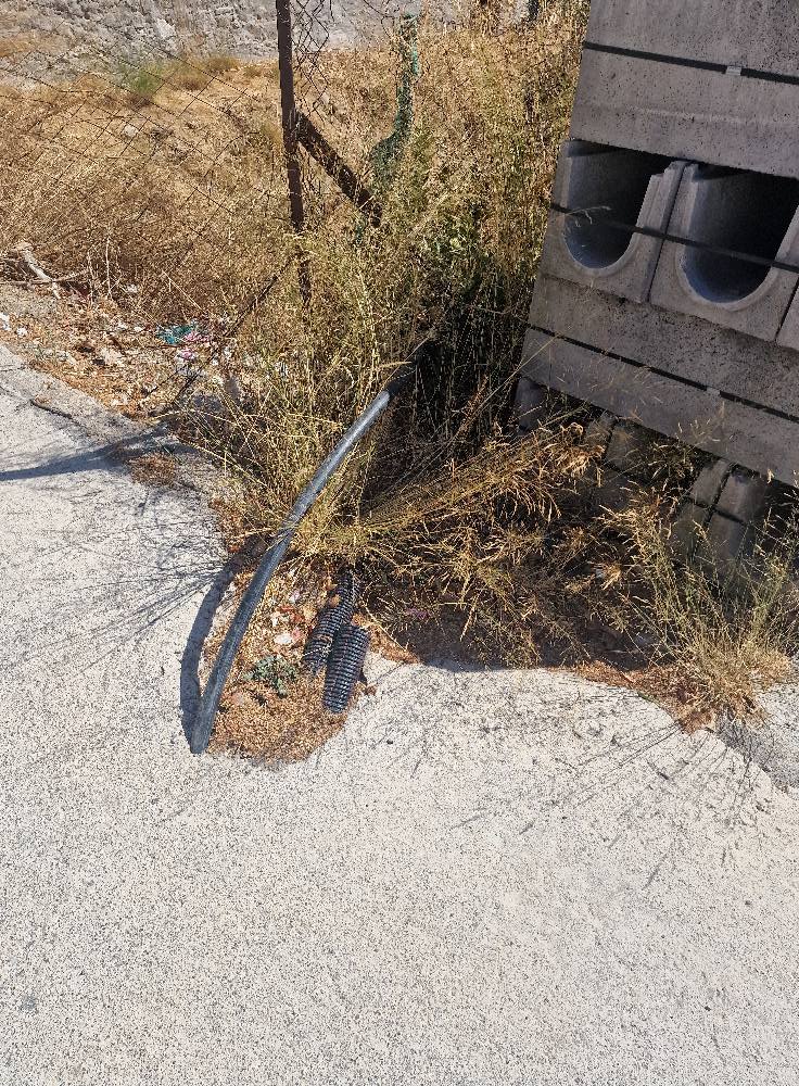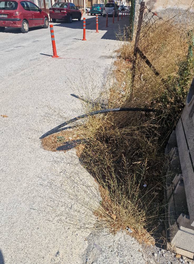 Στη συγκεκριμένη περίπτωση και στη διασταύρωση της Κλεομβρότου με την Οσίου Νίκωνος, έχει αφεθεί βαθούλωμα από όπου εξέχουν, χωρίς κάλυψη, ένα μεγάλο τυφλό λάστιχο και χαμηλά δύο μεγαλούτσικες σωλήνες, «χύμα στο κύμα»...