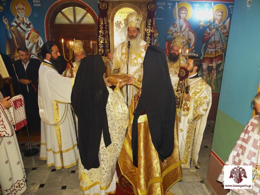 Μάλιστα, ως ανάμνηση της λαμπρής αυτής ημέρας, ο π. Λάζαρος, εκ μέρους της ενορίας, πρόσφερε στον σεβασμιώτατο κ. Συμεών και στον καθηγούμενο της ΙΜ Μεταμορφώσεως τού Σωτήρος π. Σεραφείμ από ένα ιερό επιγονάτιο. Παράλληλα, με την ευκαιρία της επετείου της συμπλήρωσης 44 ετών από την ενθρόνιση του Μητροπολίτη Ευσταθίου, τού ευχήθηκε «υγεία και έτη πολλά, ώστε να συνεχίσει απρόσκοπτα το πλούσιο πνευματικό, φιλανθρωπικό και κοινωνικό του έργο».